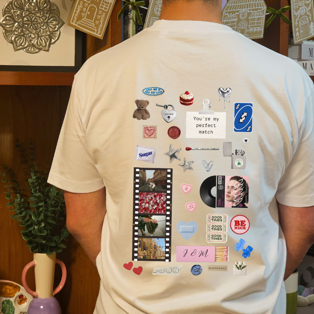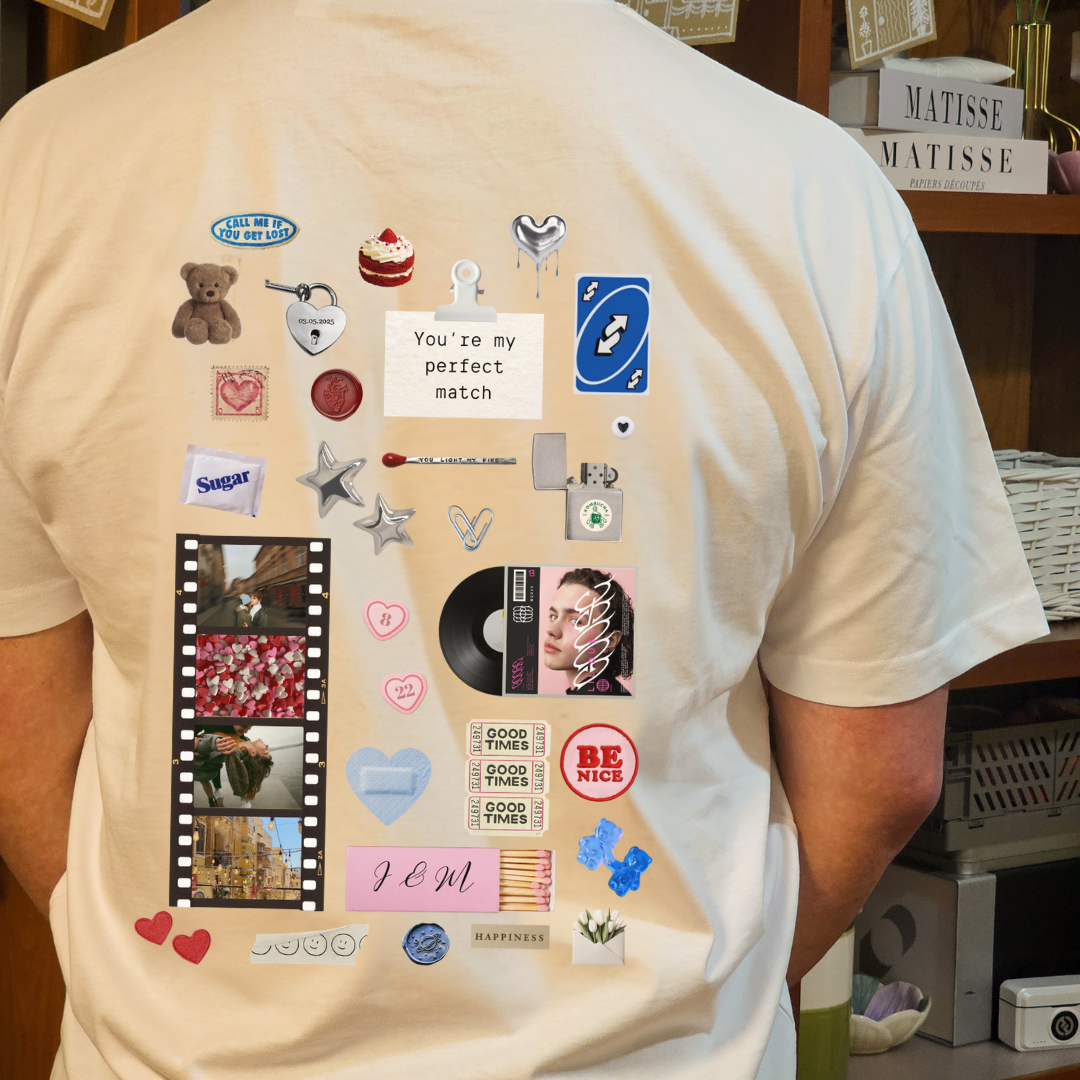 Este modelo es un collage romántico lleno de pequeñas cosas que os representan: fotos, corazones, canciones, detallitos y símbolos especiales. Tú editas la plantilla en Canva y nosotras transformamos tu diseño en una camiseta oversize única, hecha para celebrar vuestra historia.