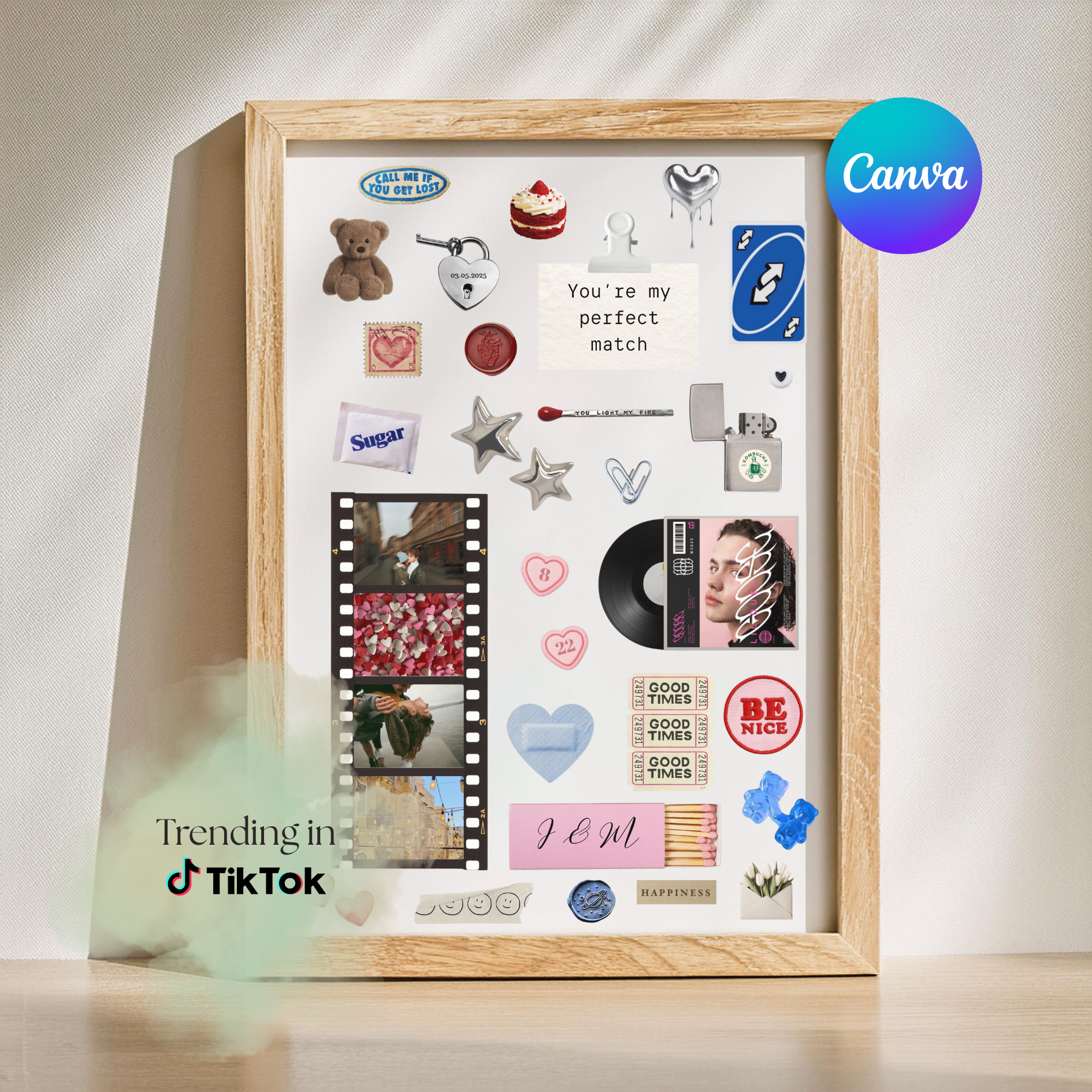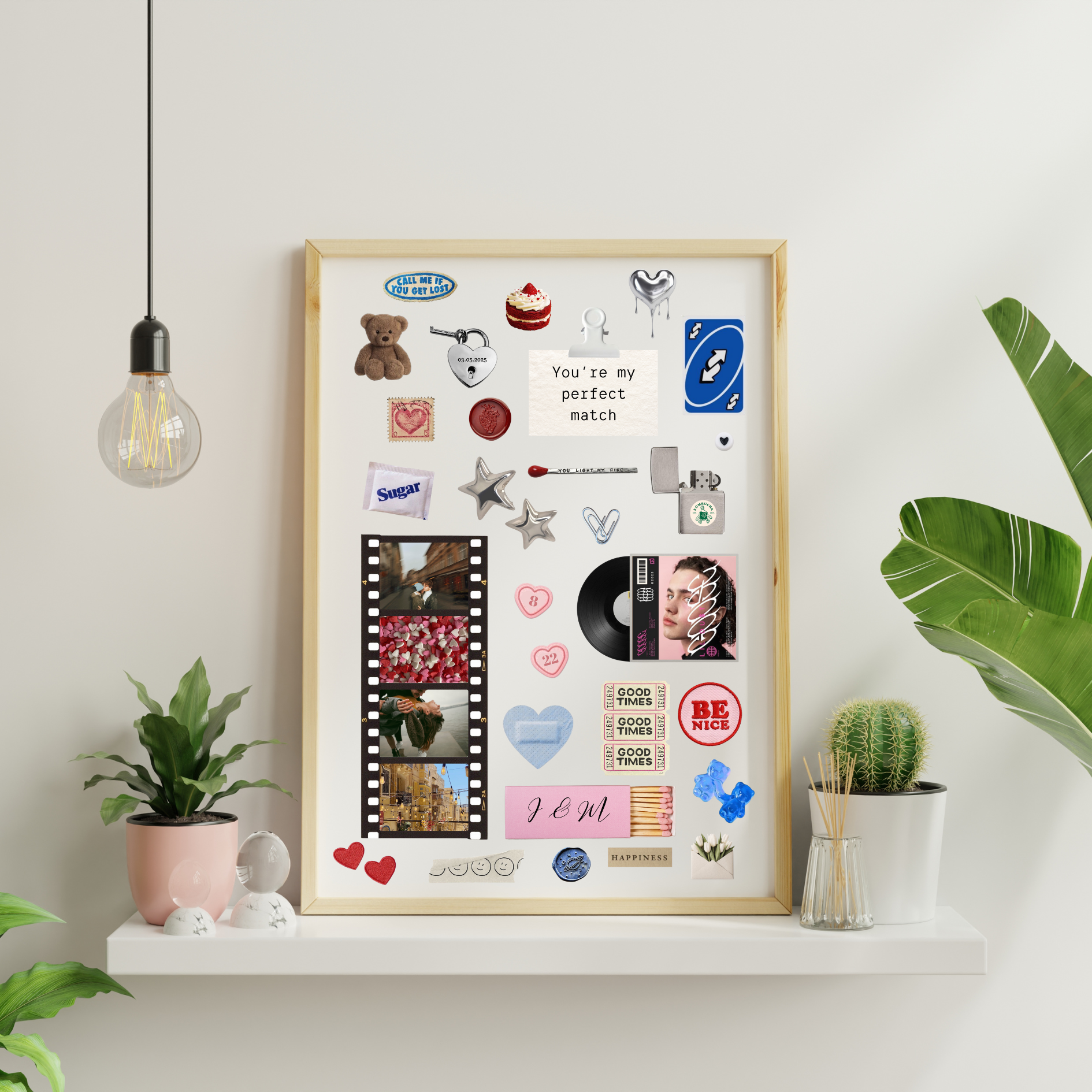 Añades tus fotos, iconos, frases y todos esos pequeños recuerdos que hacen vuestro collage especial.
