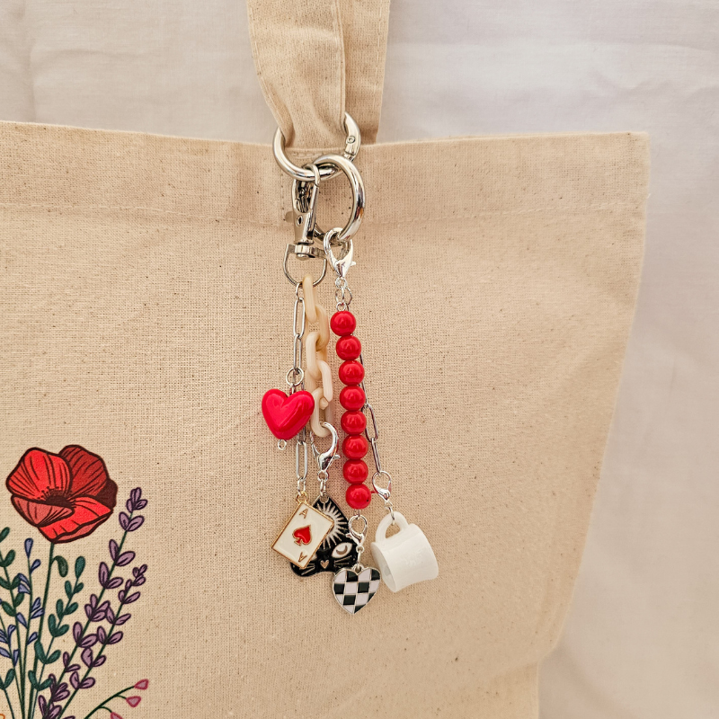 Inspirado en los cuentos de hadas, este accesorio combina elementos mágicos y aesthetic: un corazón rojo, una carta de corazones, un planchette místico, un corazón ajedrezado y una mini taza de café. Un mix spooky-cute perfecto para tu bolso o mochila.