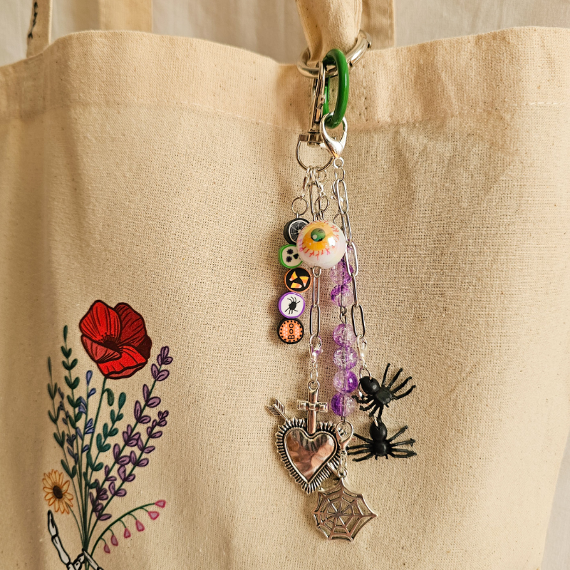 Este llavero combina abalorios morados, un ojo realista y charms metálicos que lo hacen único. Cuélgalo en tu tote favorita para ir a clase, la librería o tu rincón de lectura.