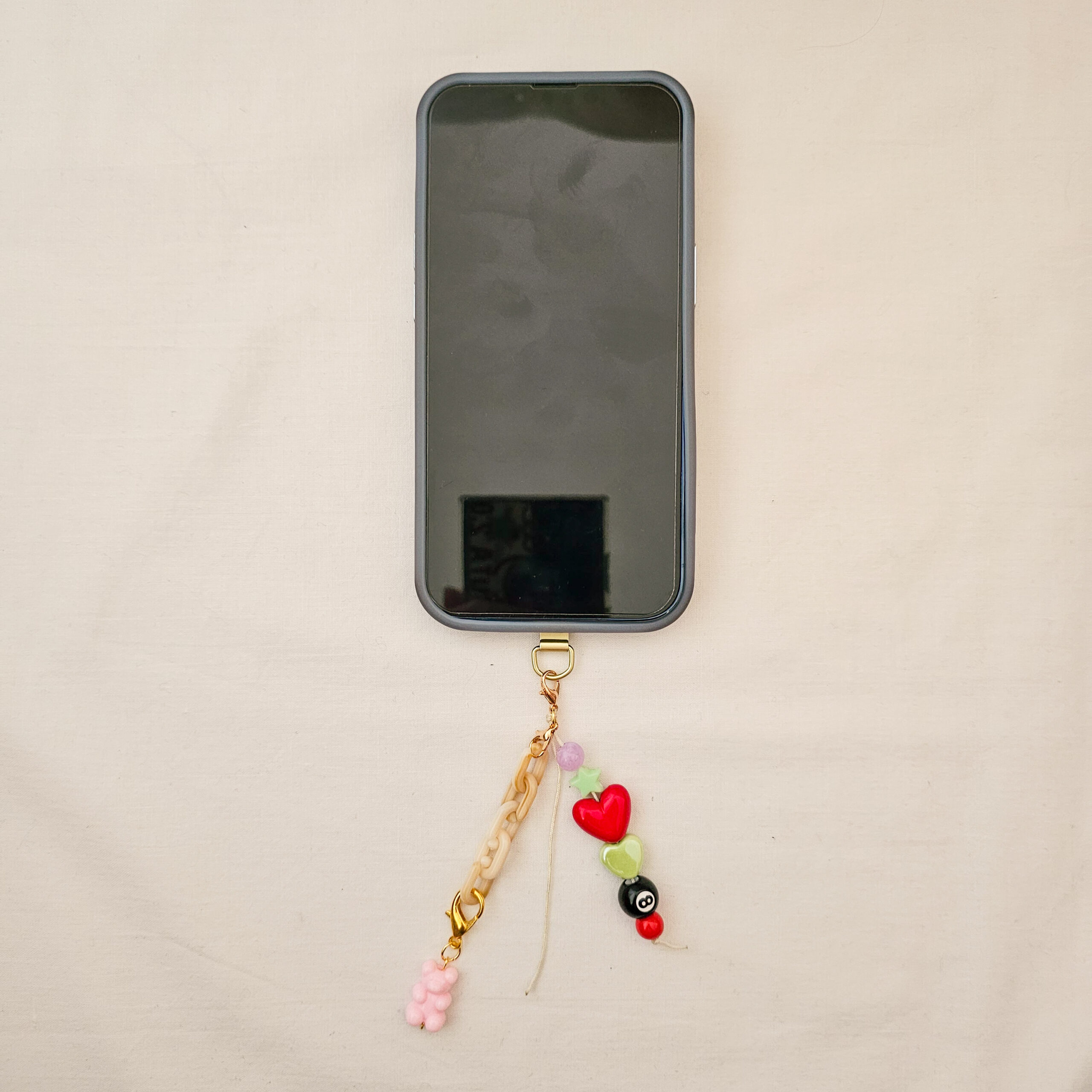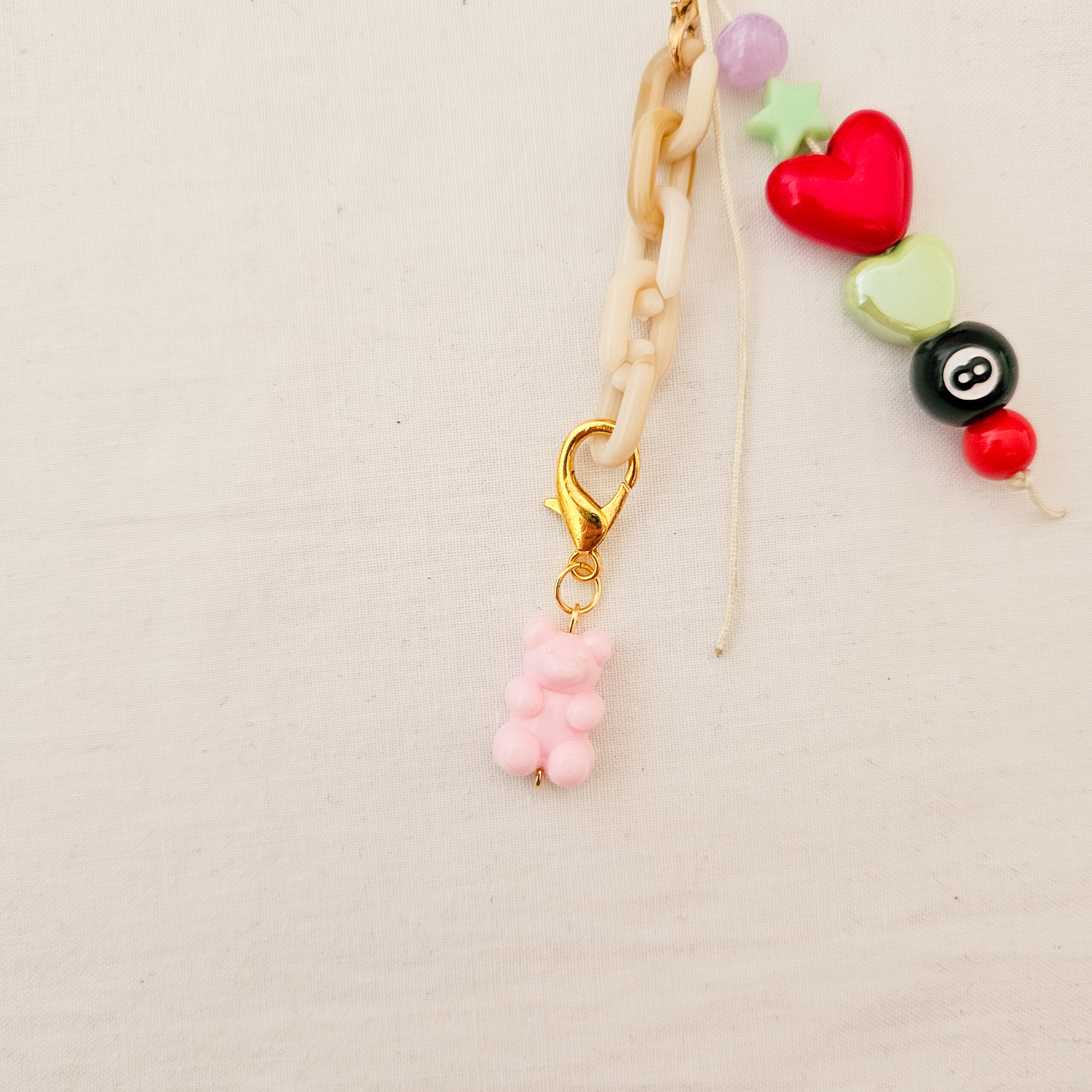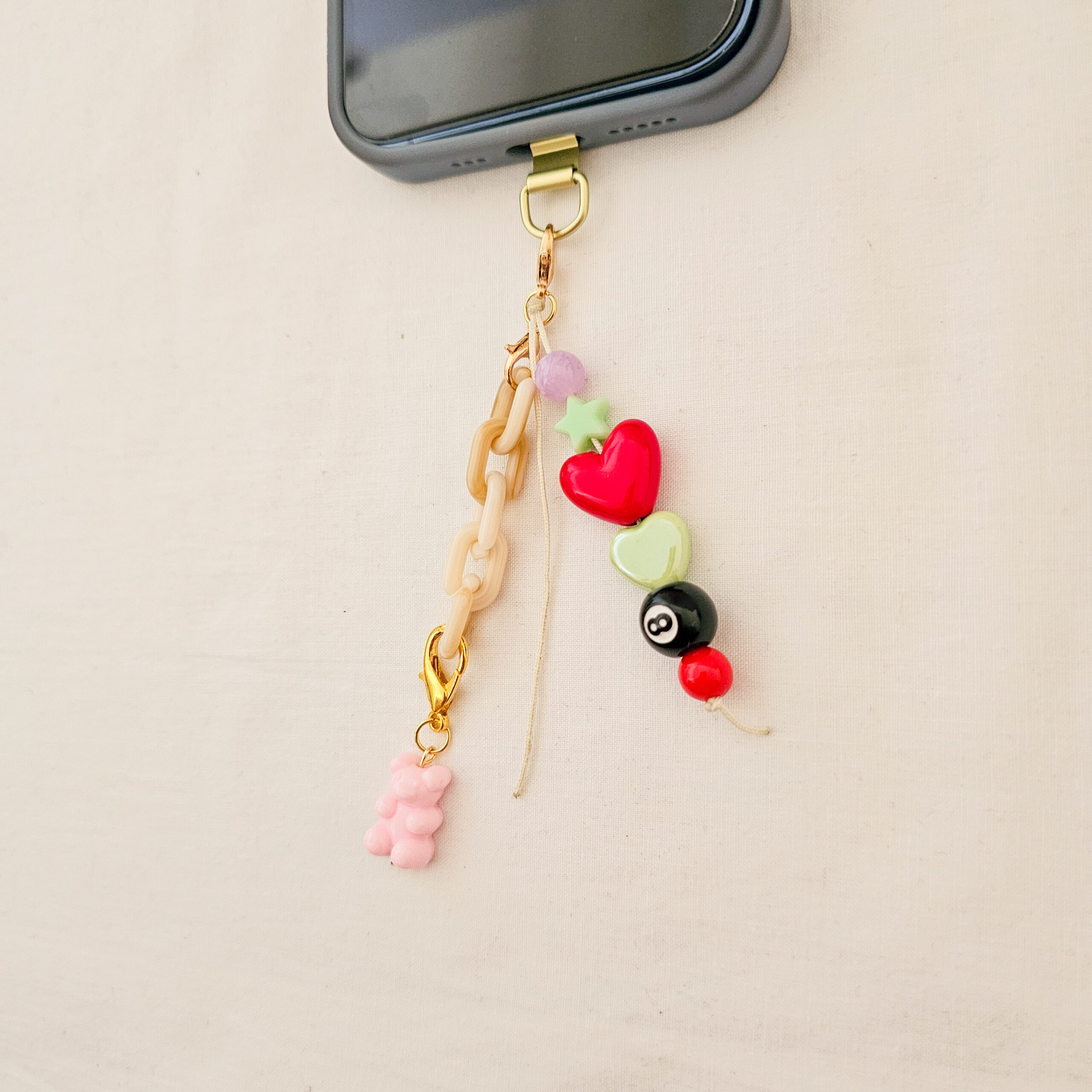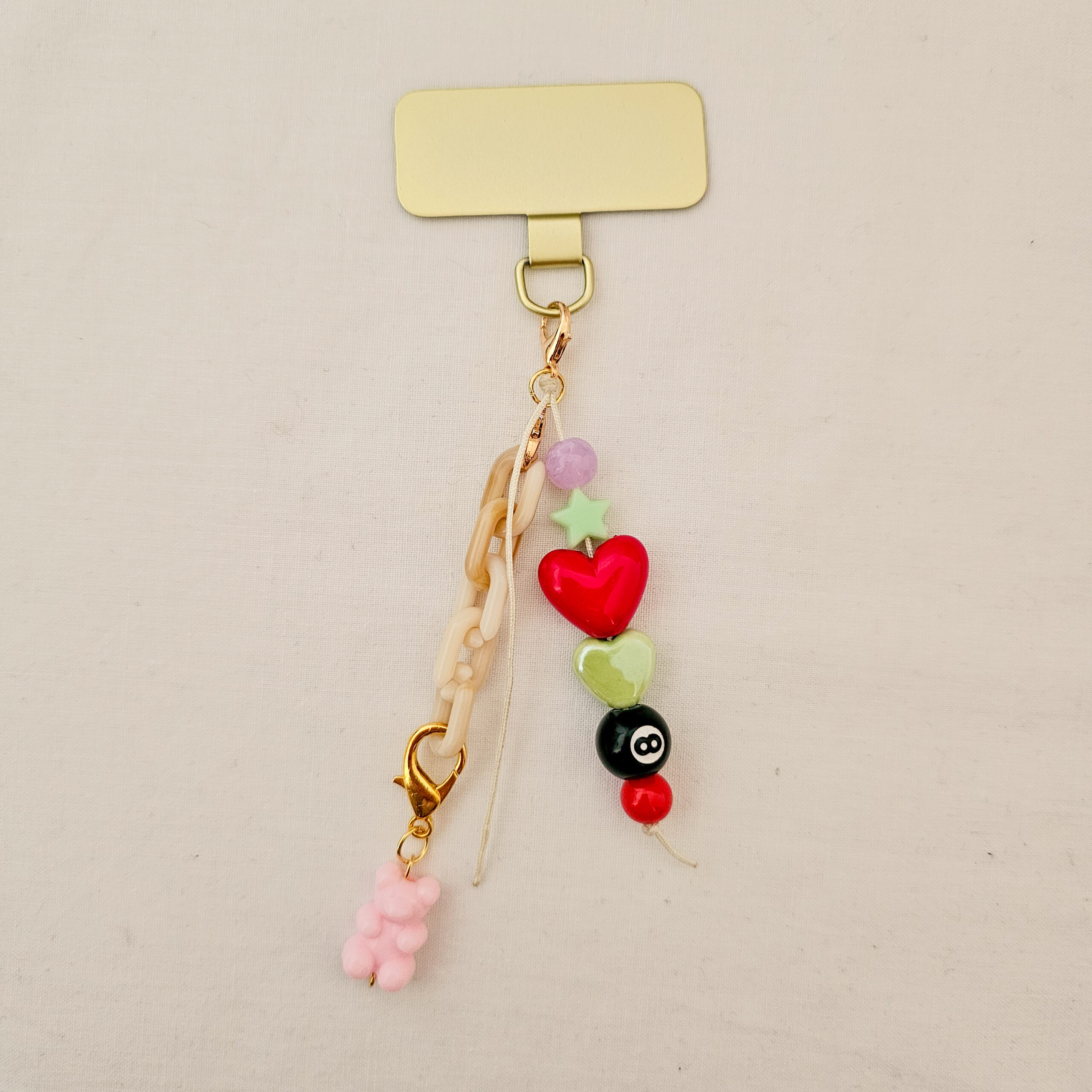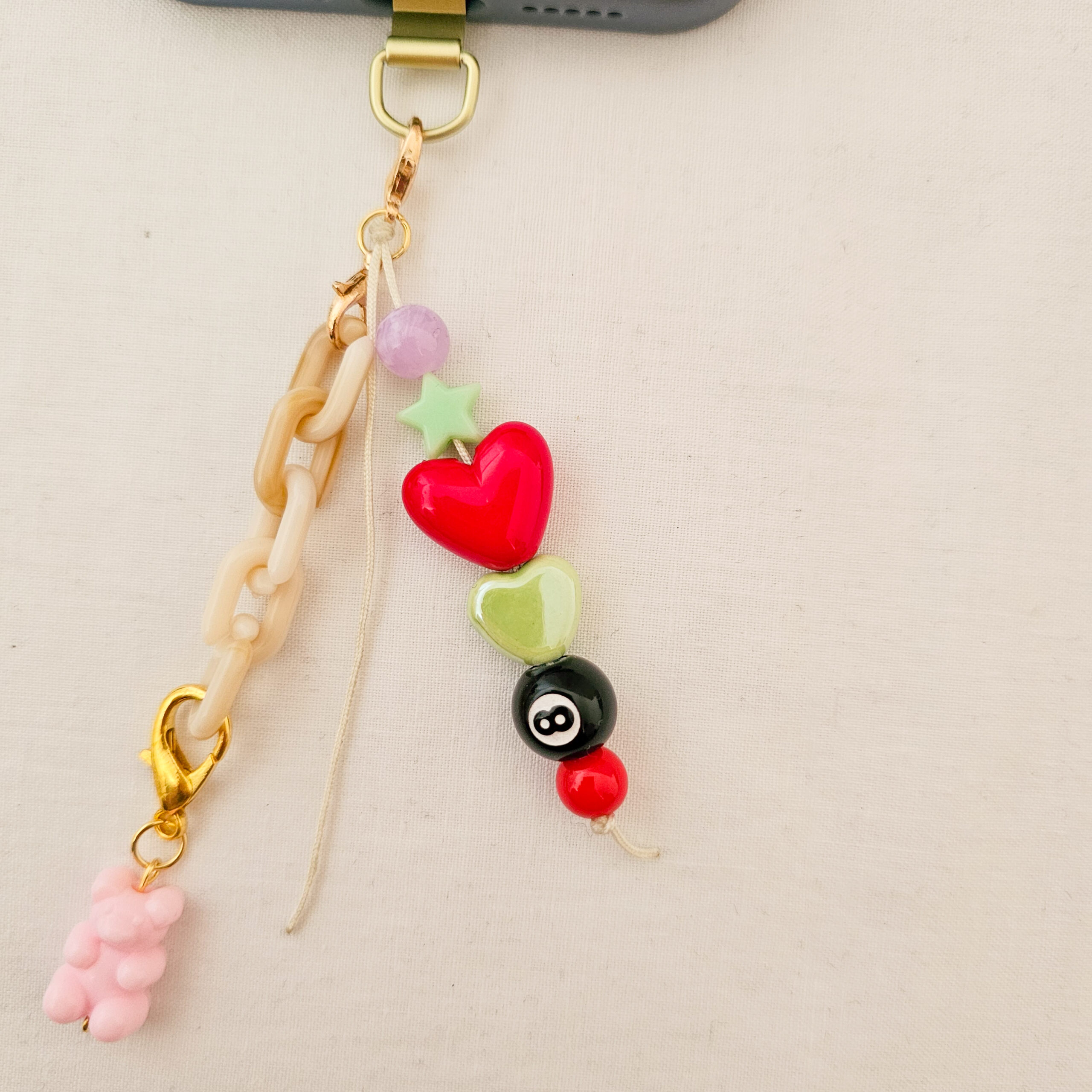 Este phone charm hecho a mano en el estudio de Limeteart combina lo mejor del estilo colorful aesthetic: un osito rosa supercuqui, un corazón rojo brillante, un corazón verde pastel, una cuenta de estrella y la icónica bola 8, todo acompañado de una mini cadena beige que le da un toque trendy y especial.