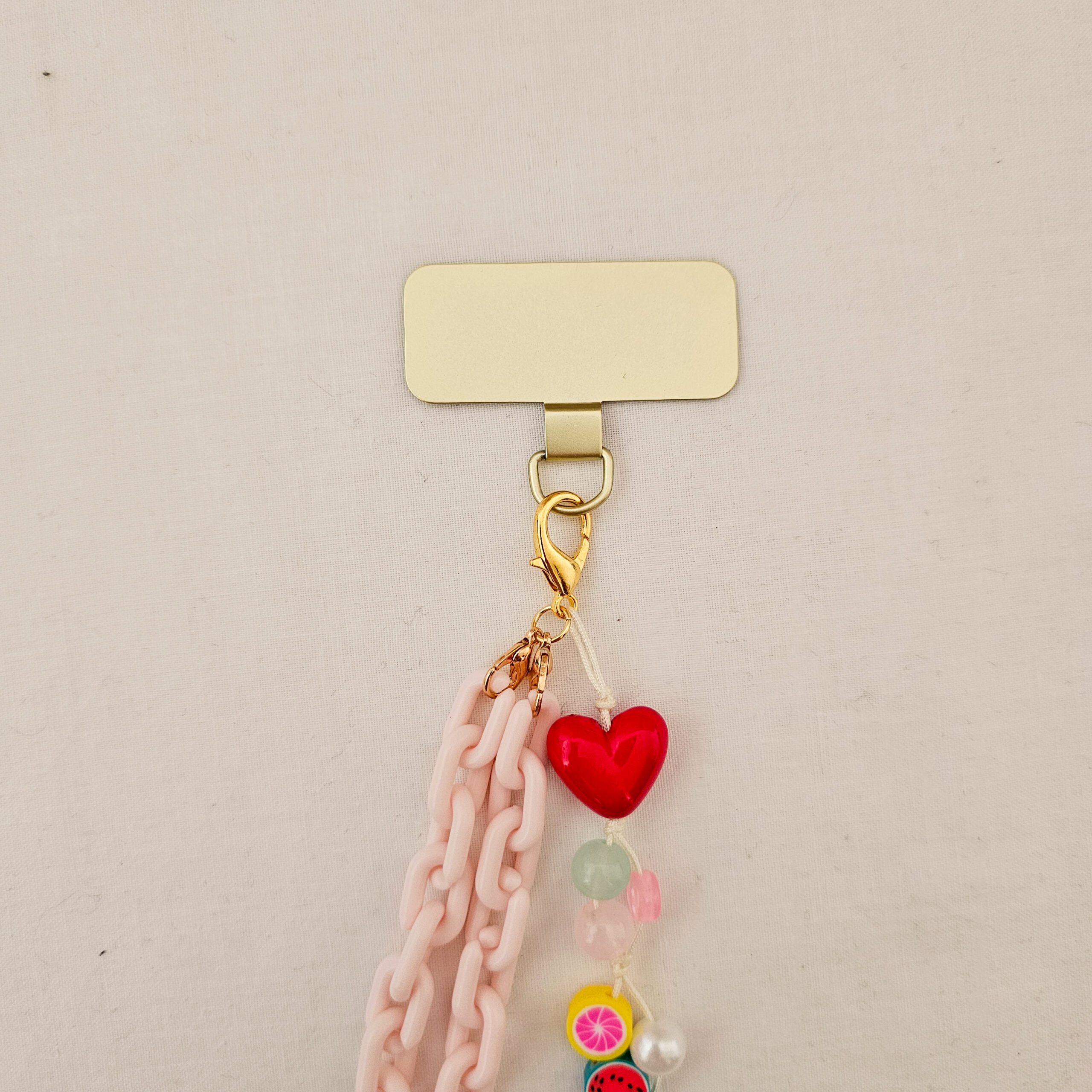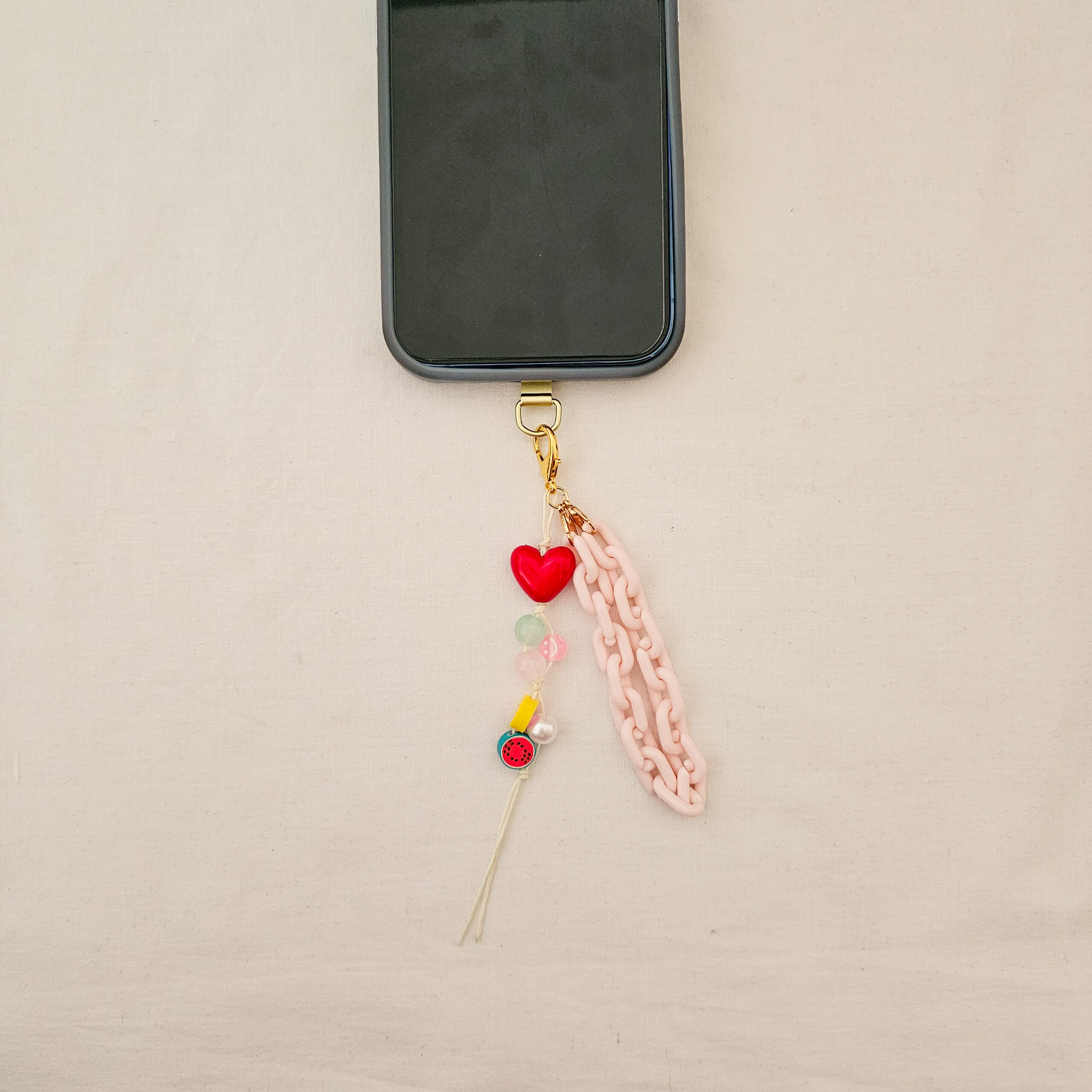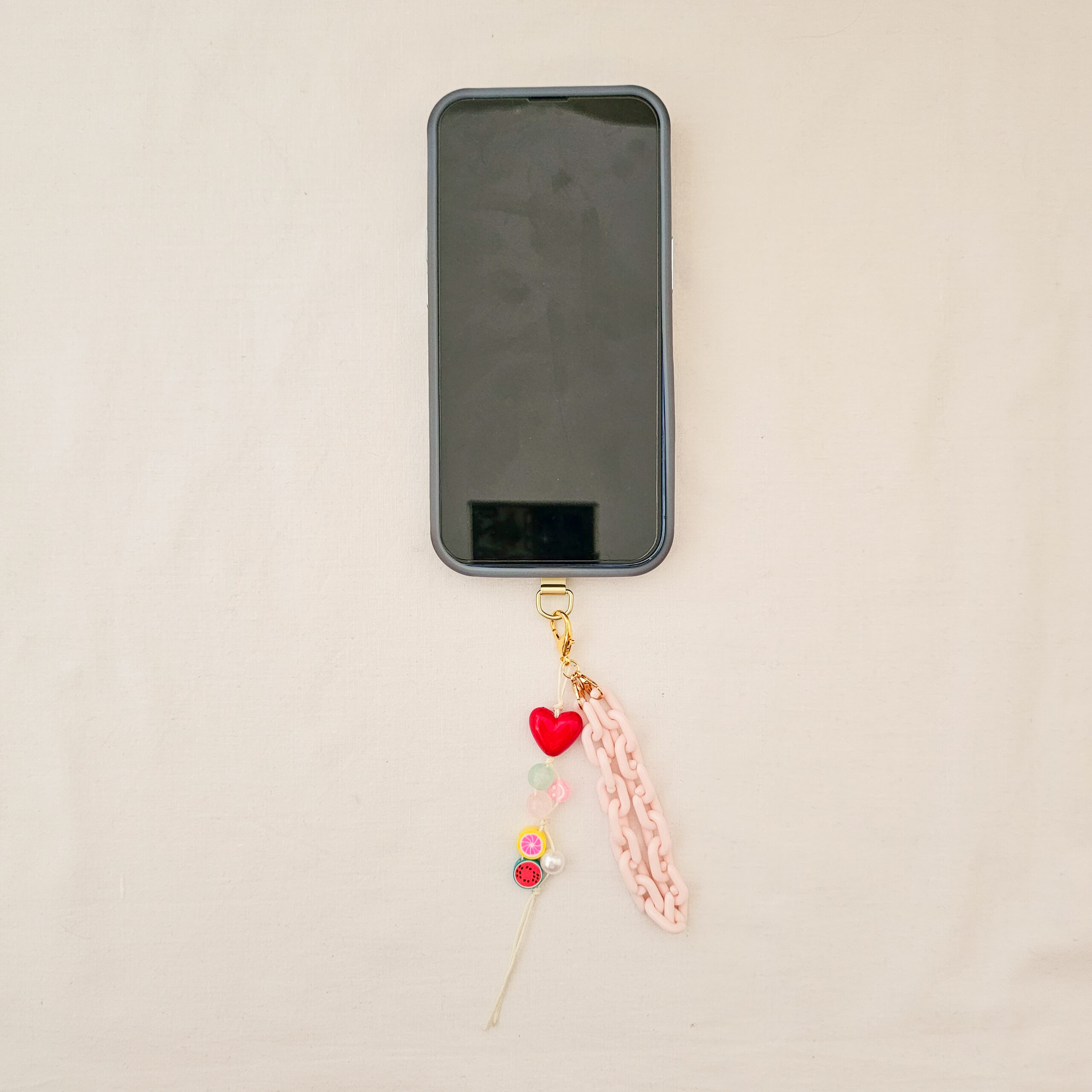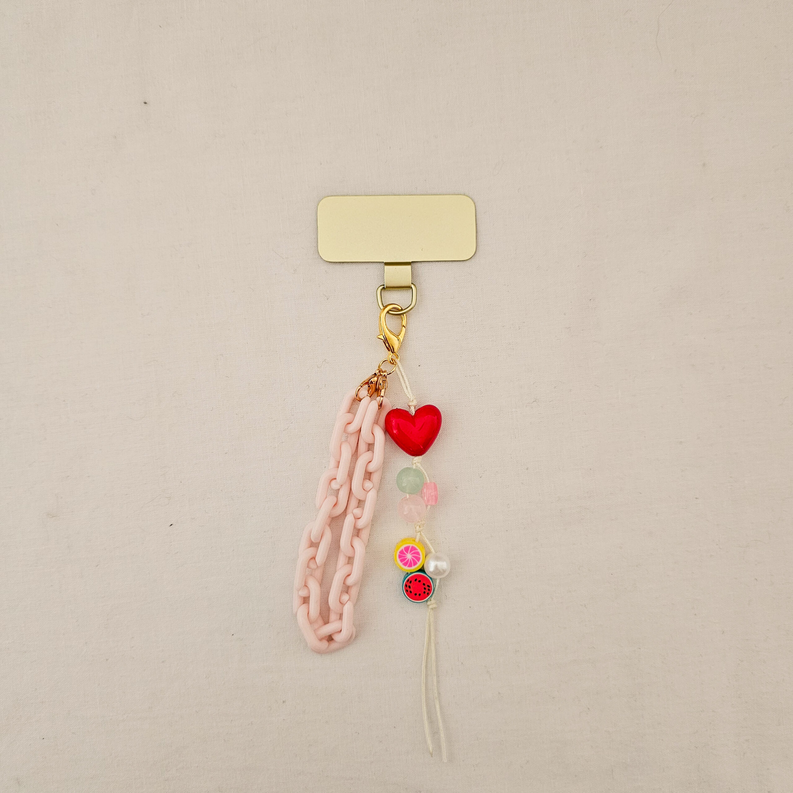 El phone charm “Candy Chain” combina una cadenita rosa pastel con abalorios cute y un corazón rojo brillante que roba miradas desde el primer momento.