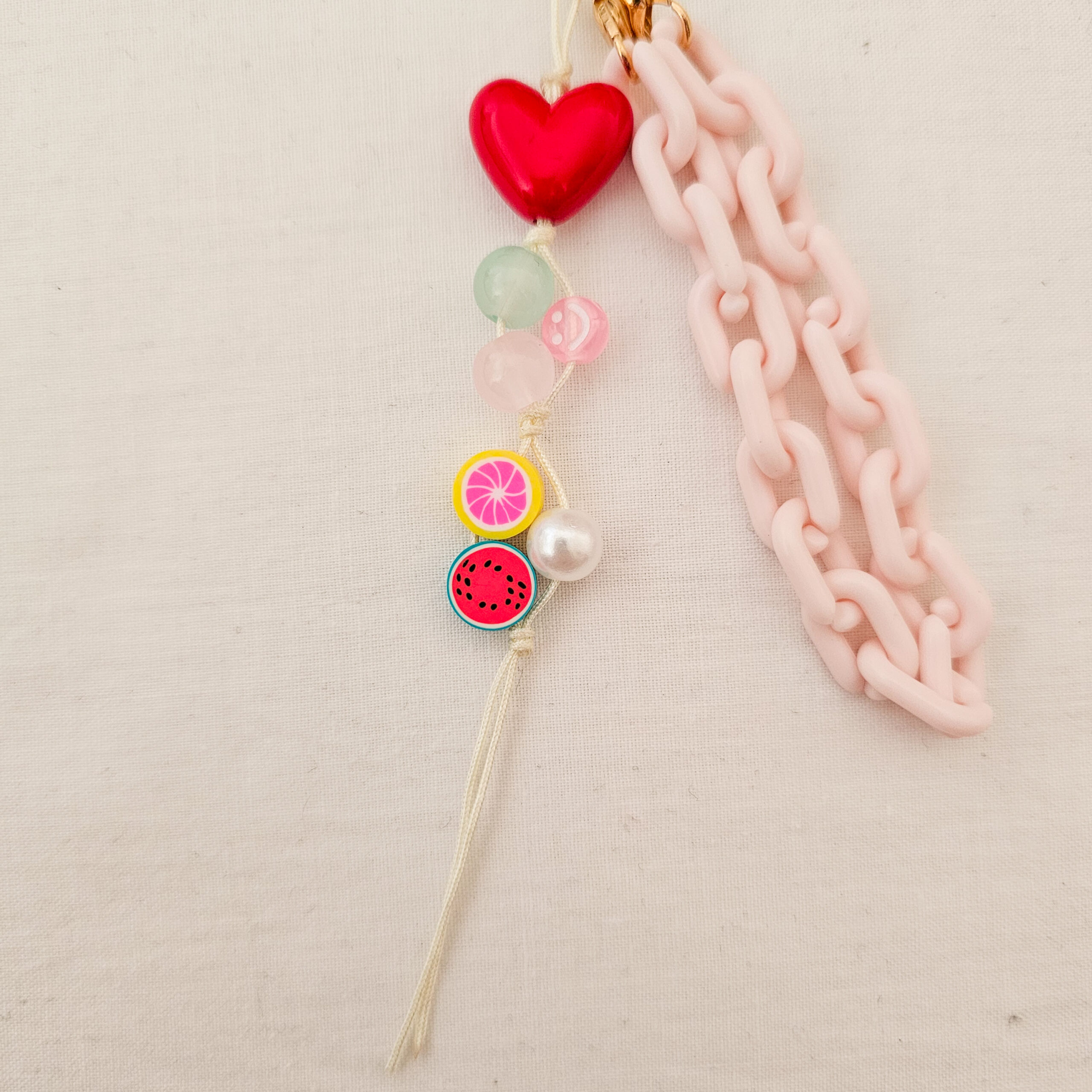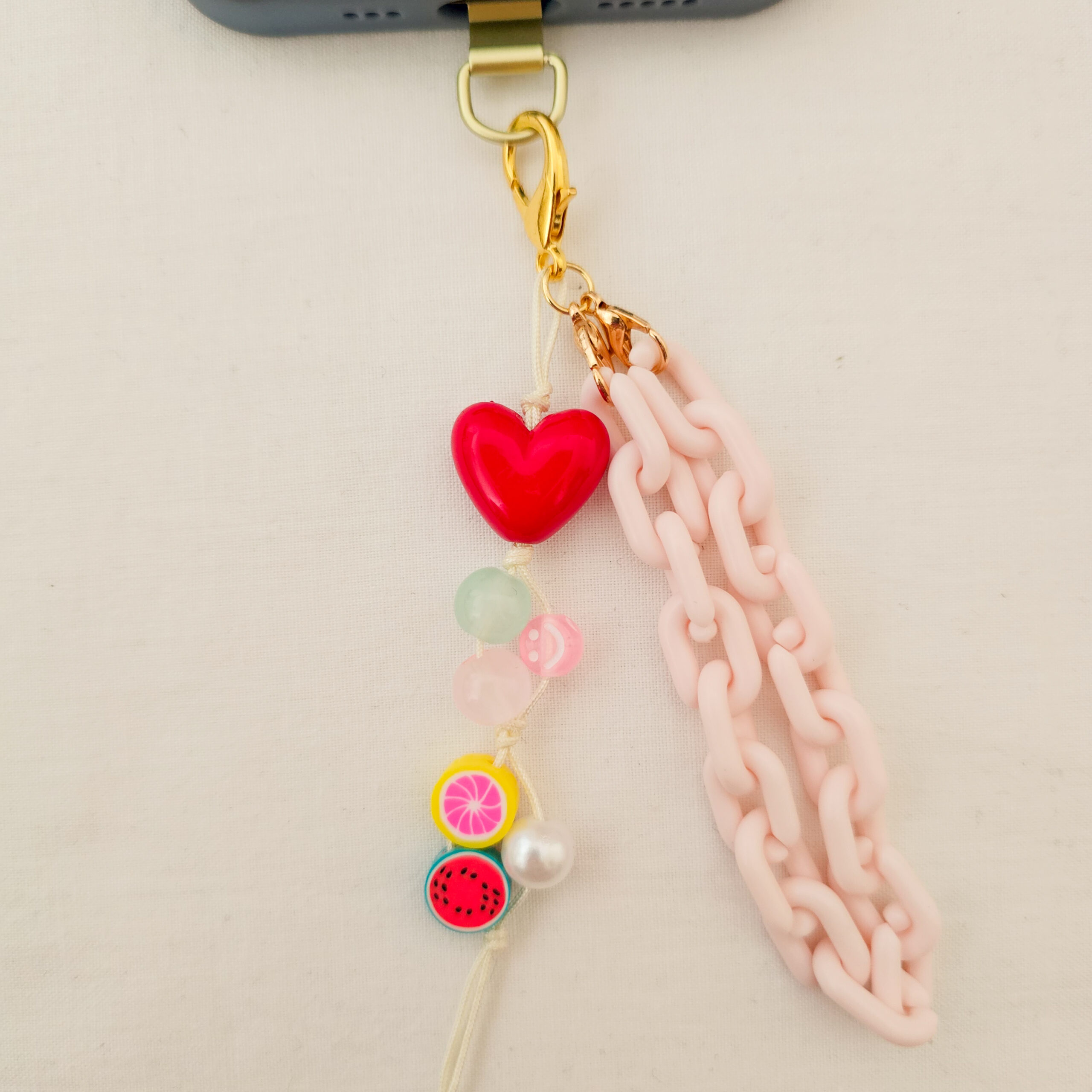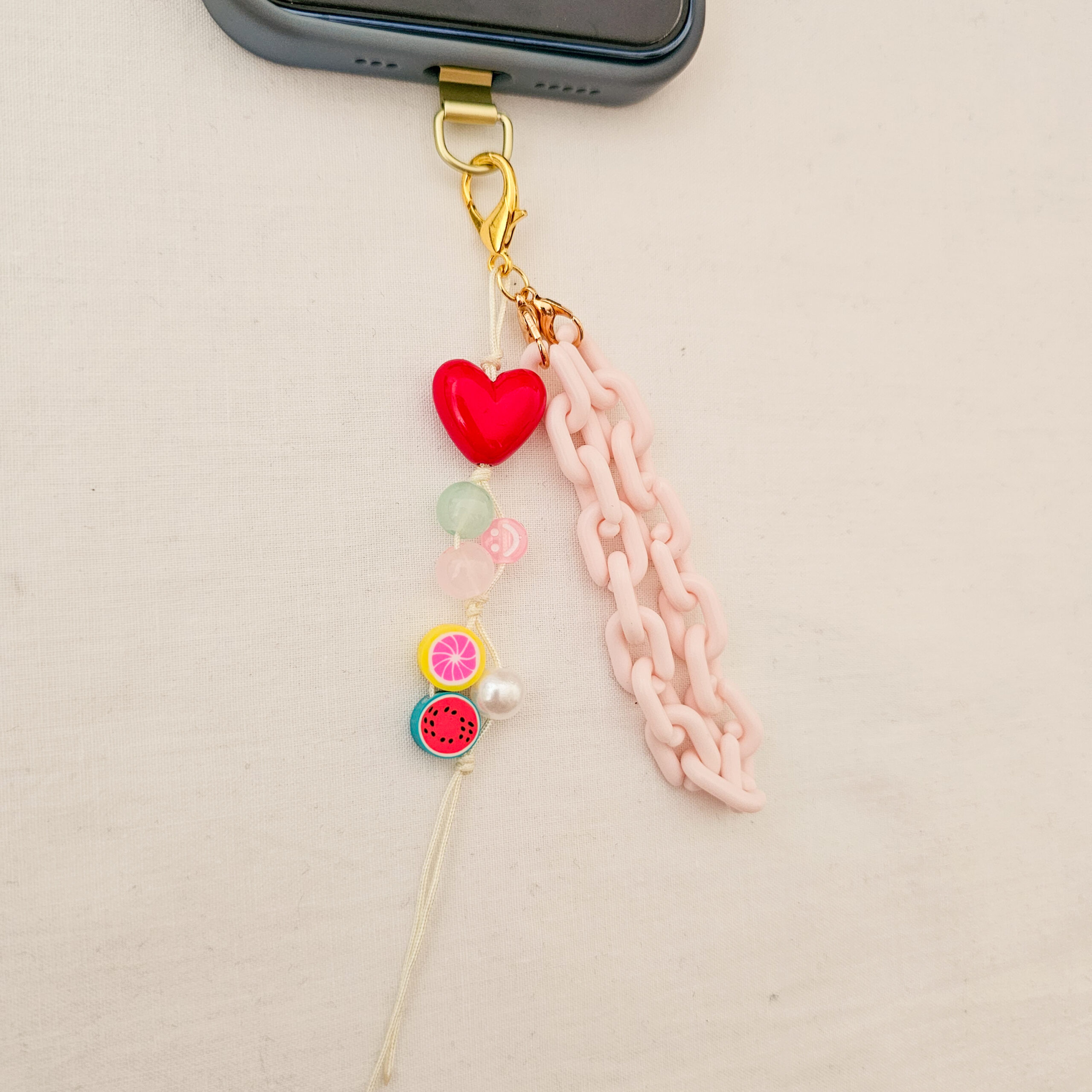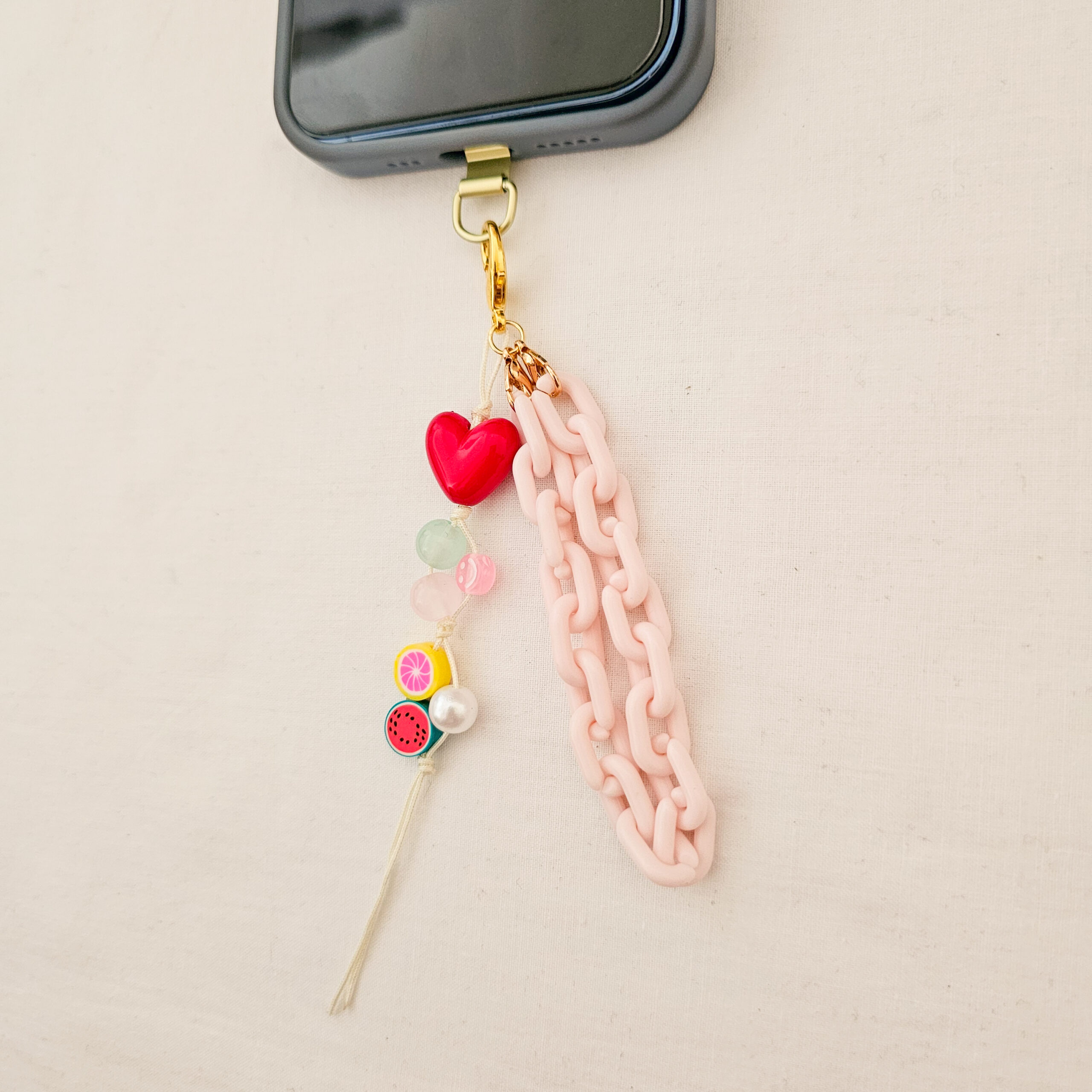 El phone charm “Candy Chain” combina una cadenita rosa pastel con abalorios cute y un corazón rojo brillante que roba miradas desde el primer momento.