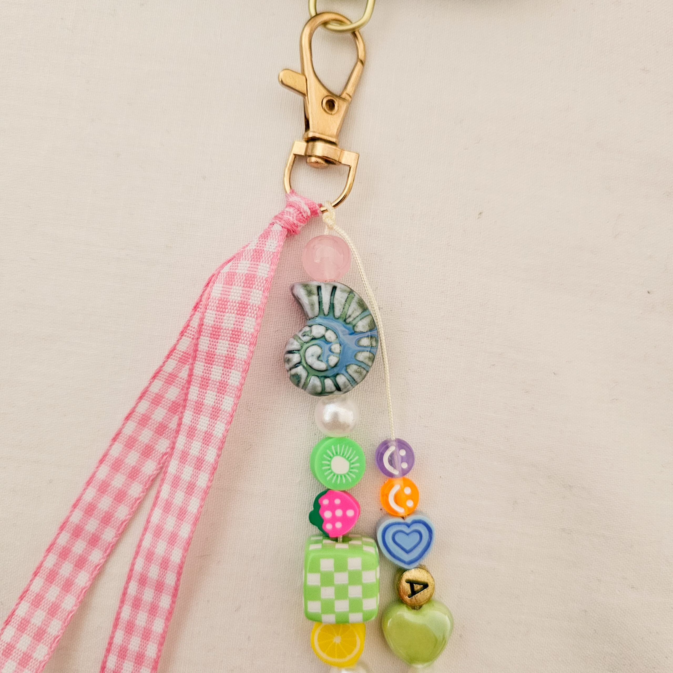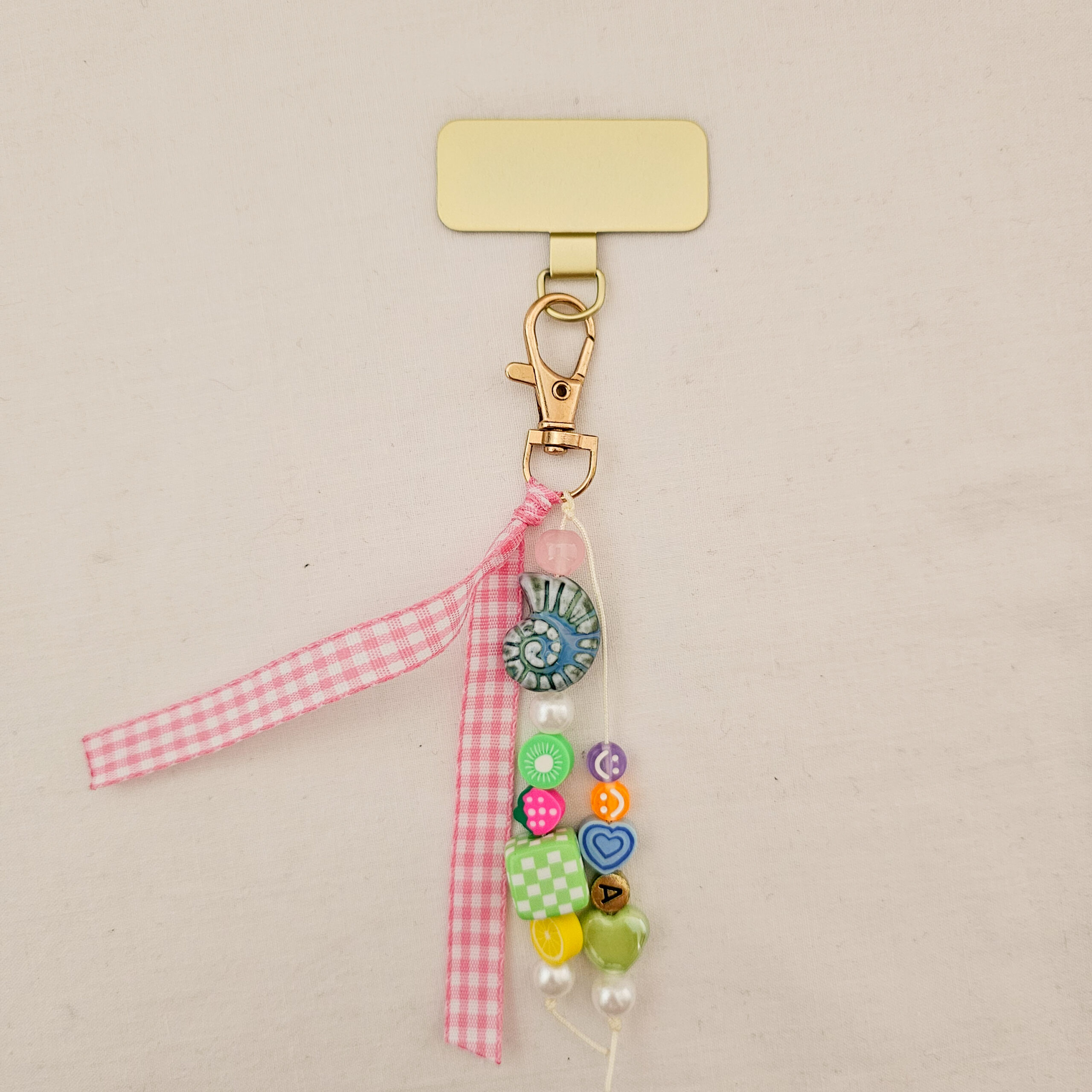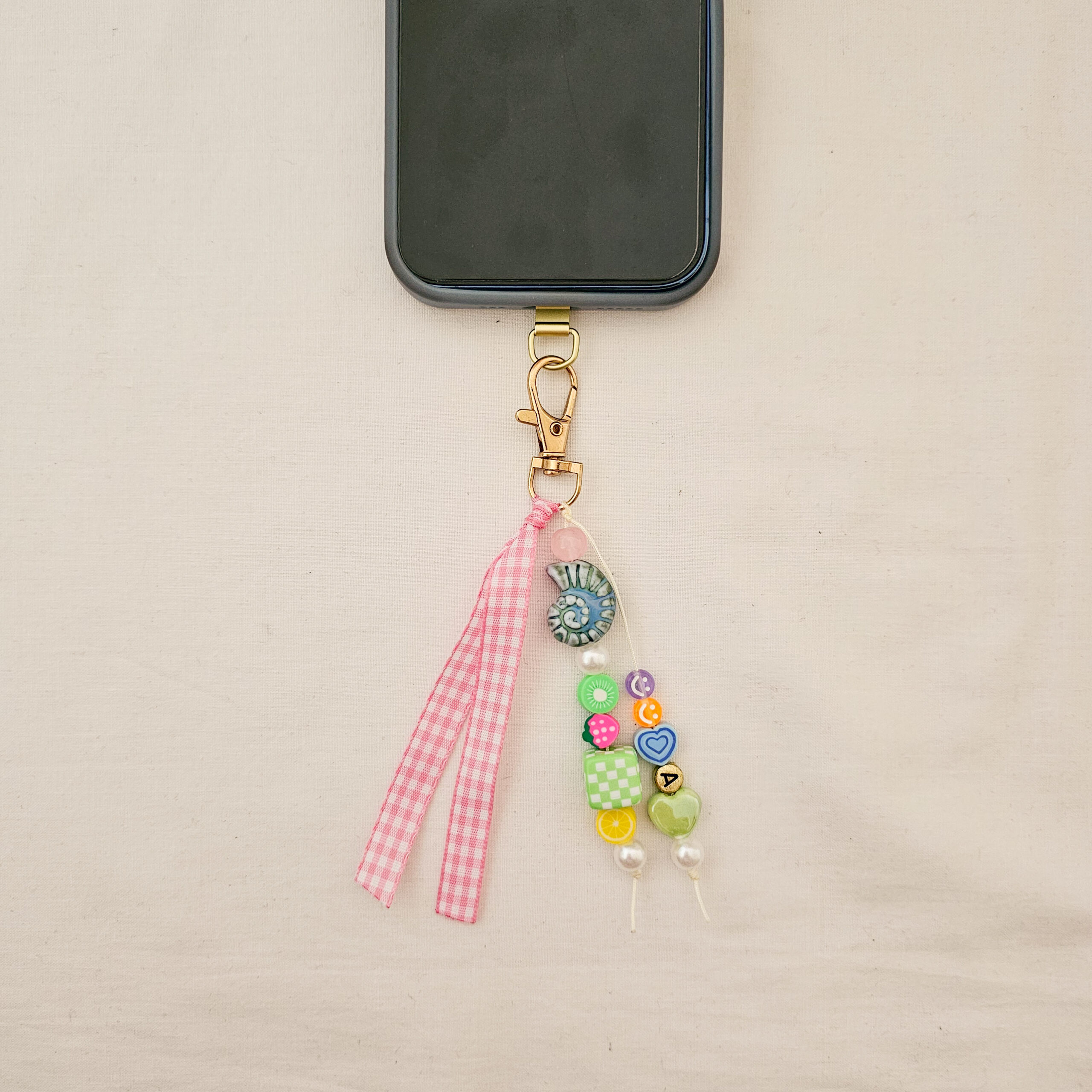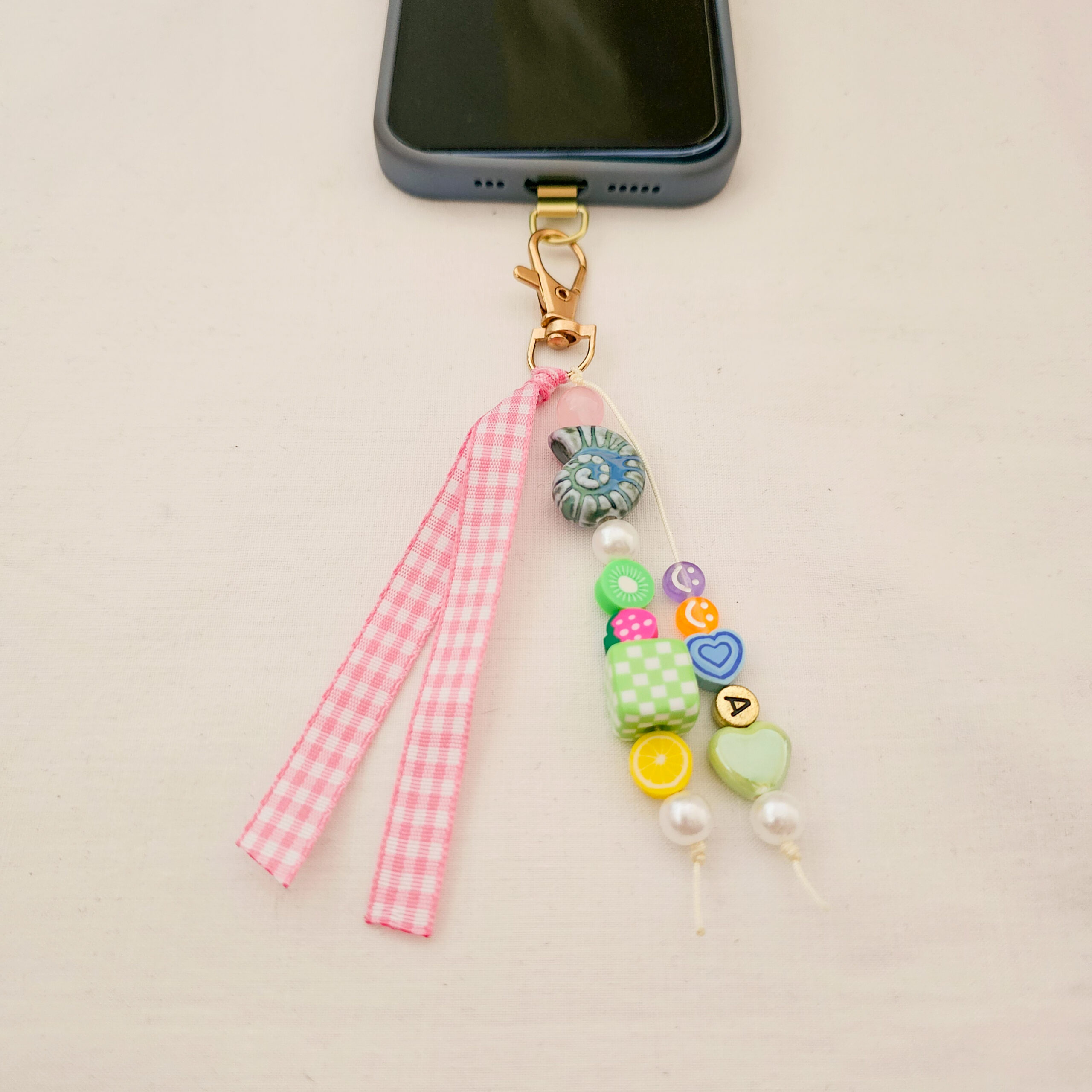 Este phone charm hecho a mano en el estudio de Limeteart combina abalorios vibrantes, detalles fruity y un lazo vichy rosa cosido a mano que aporta ese toque coquette tan especial.