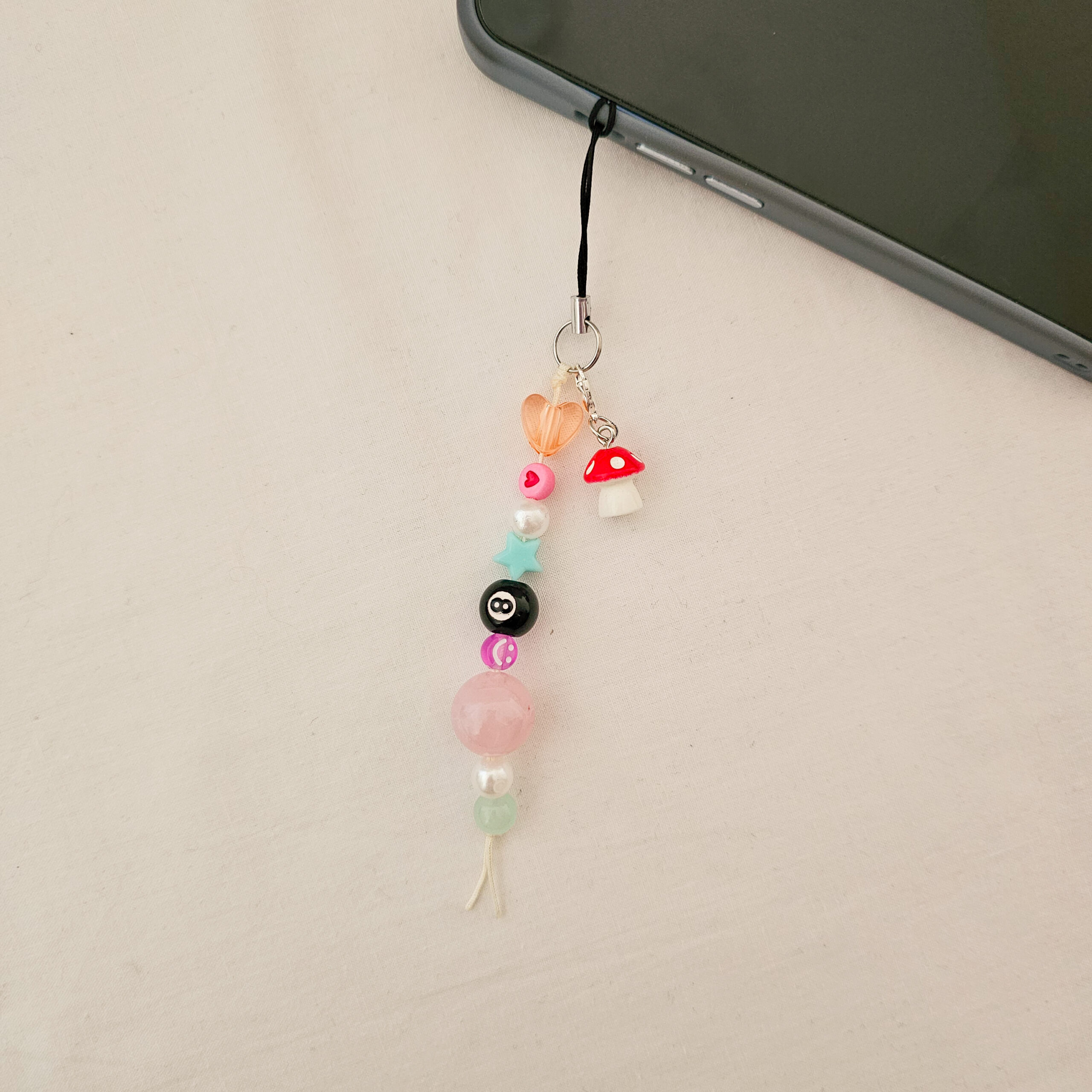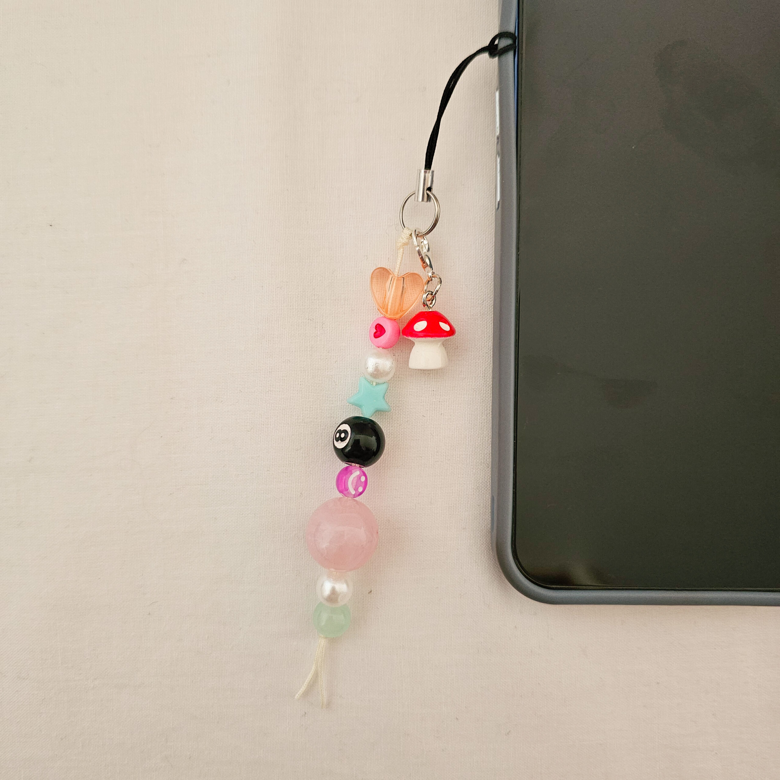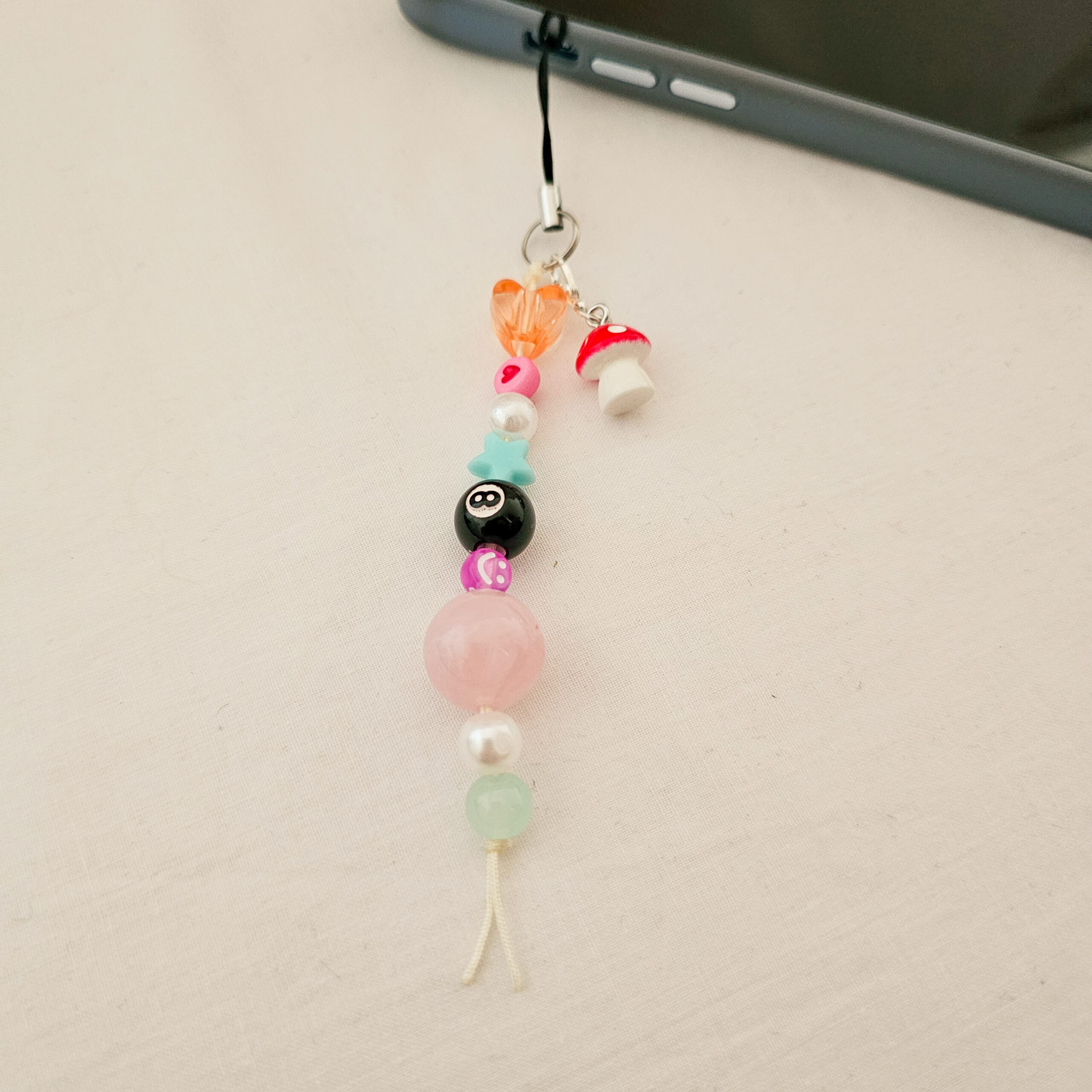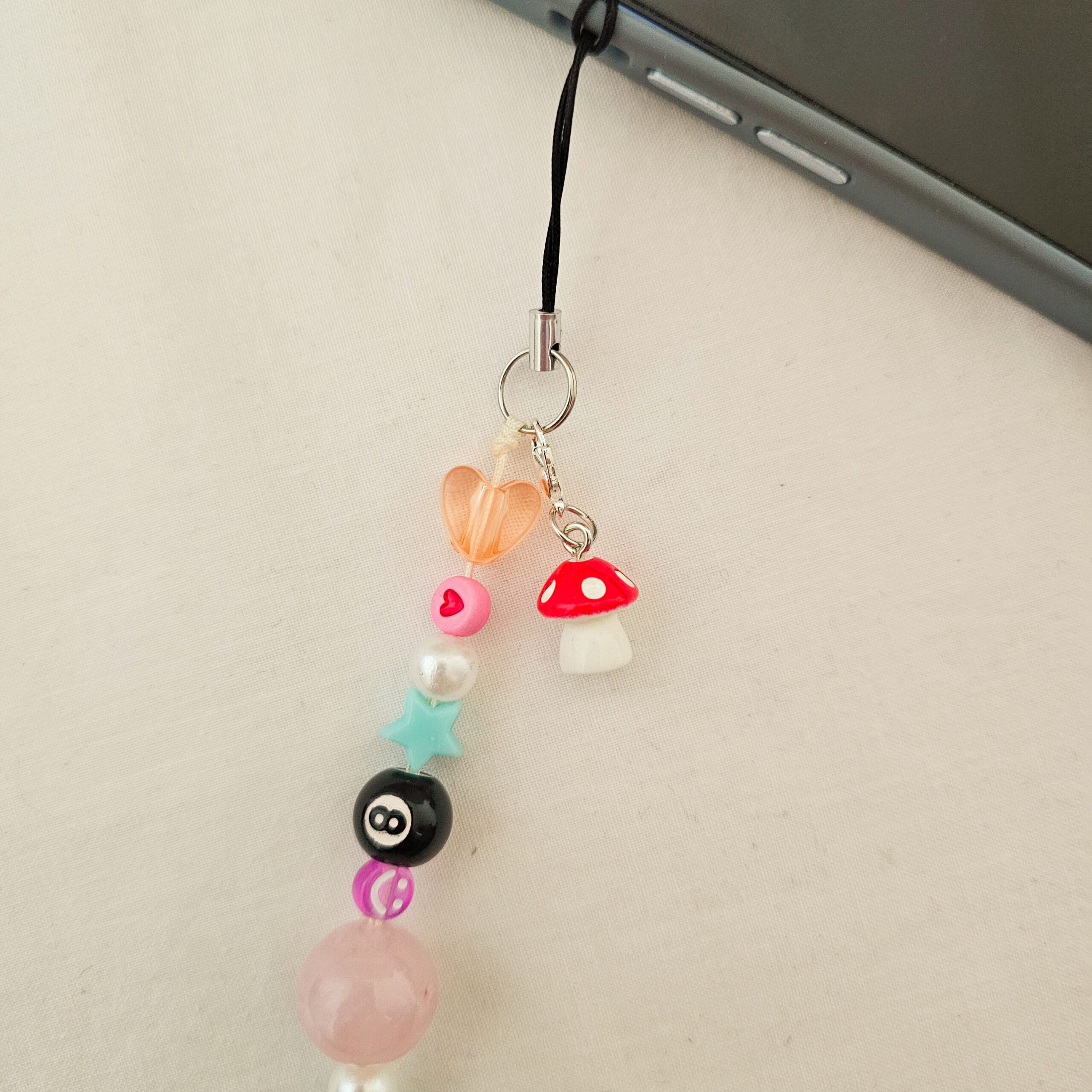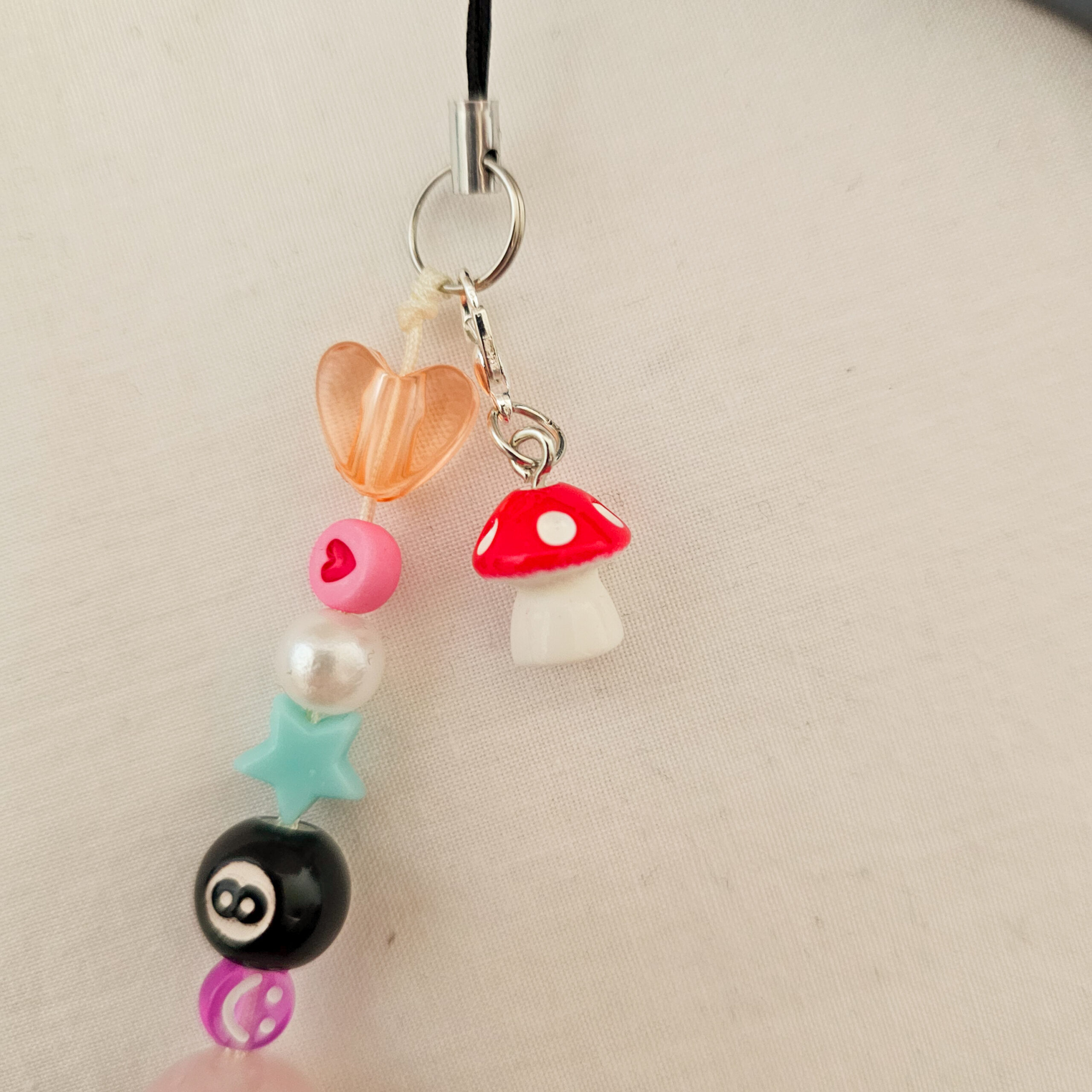 “Mushy Magic” es un phone charm hecho a mano en el estudio de Limeteart que combina una mini seta roja adorable con abalorios pastel, estrellas, perlitas y una bola 8 retro que le da un toque divertido y muy especial.
