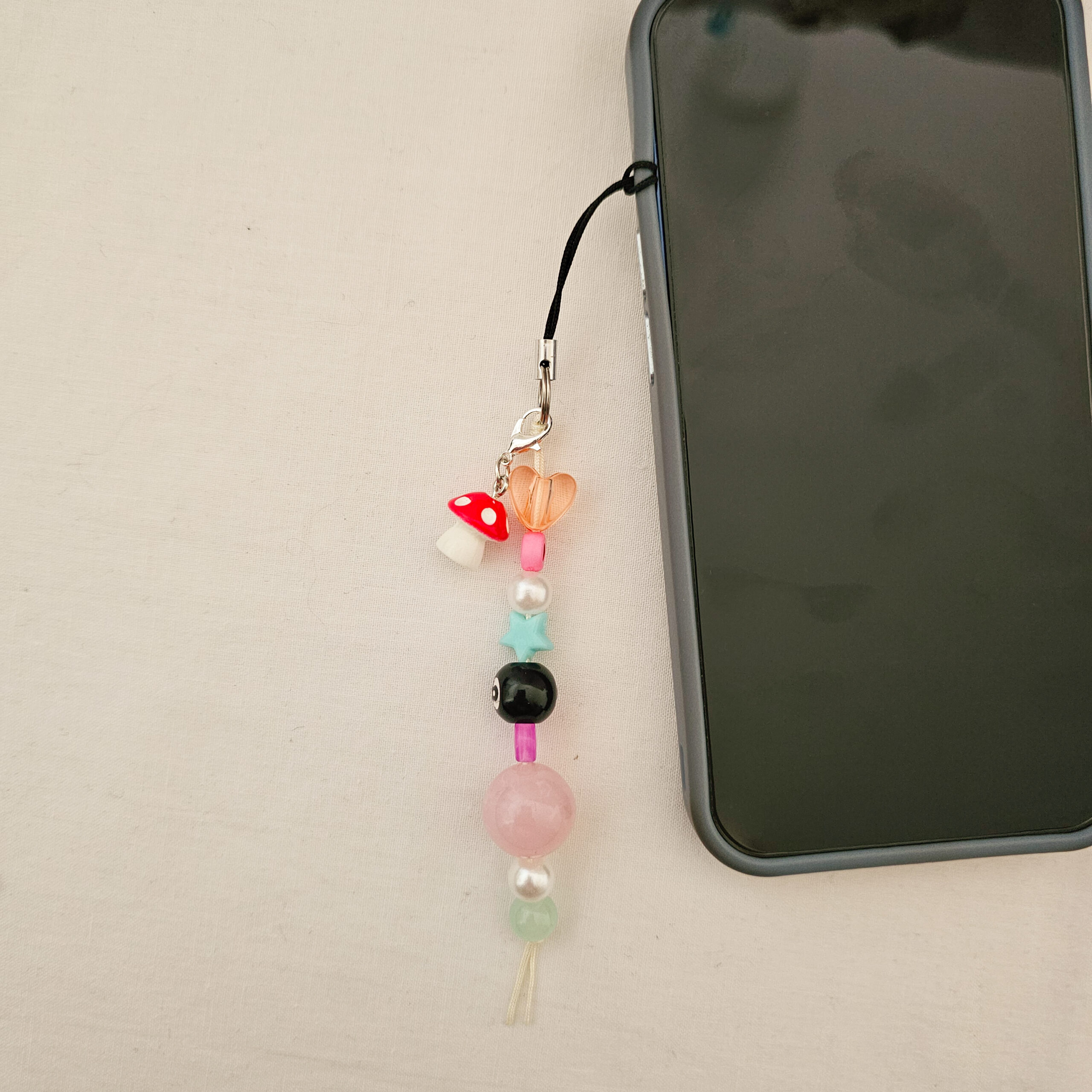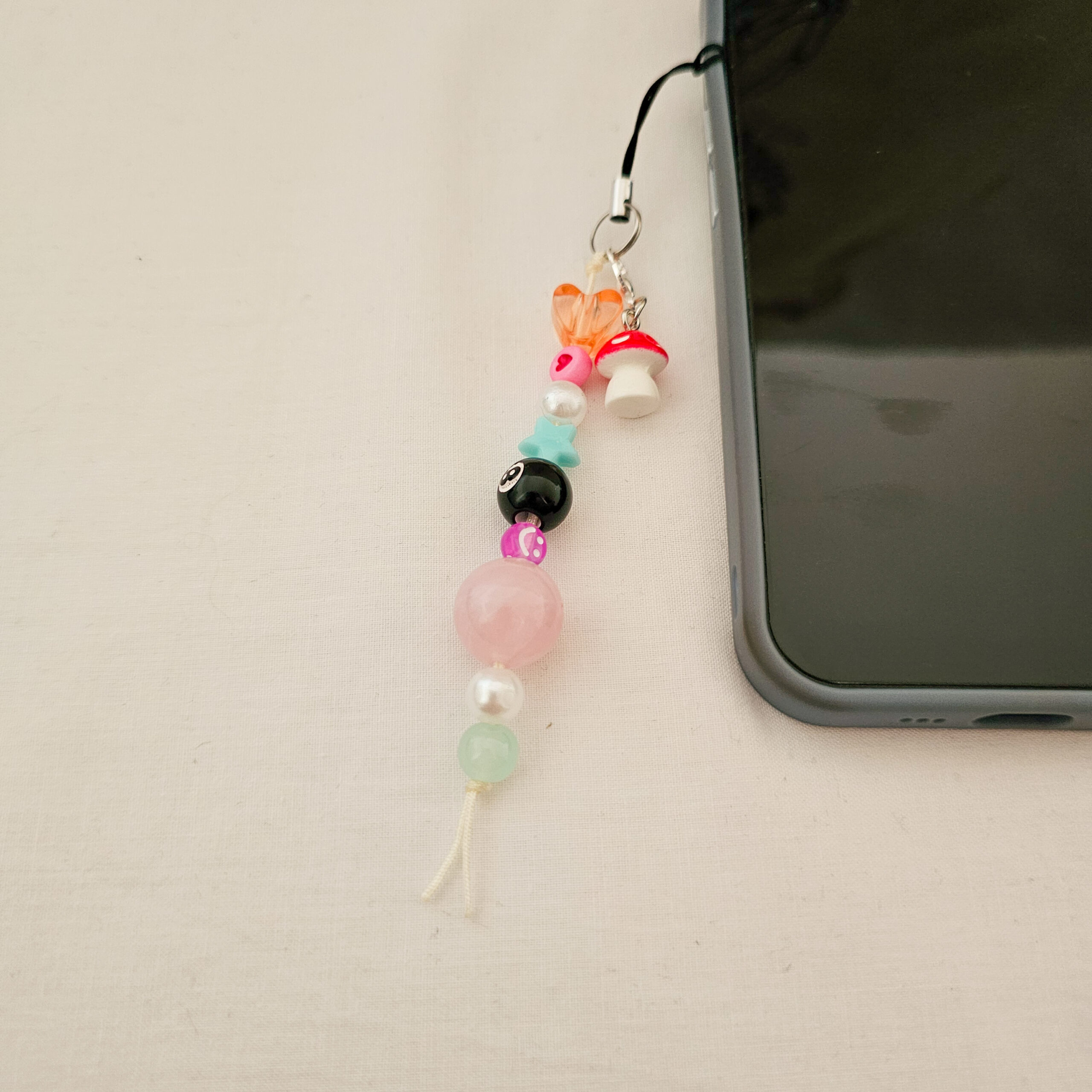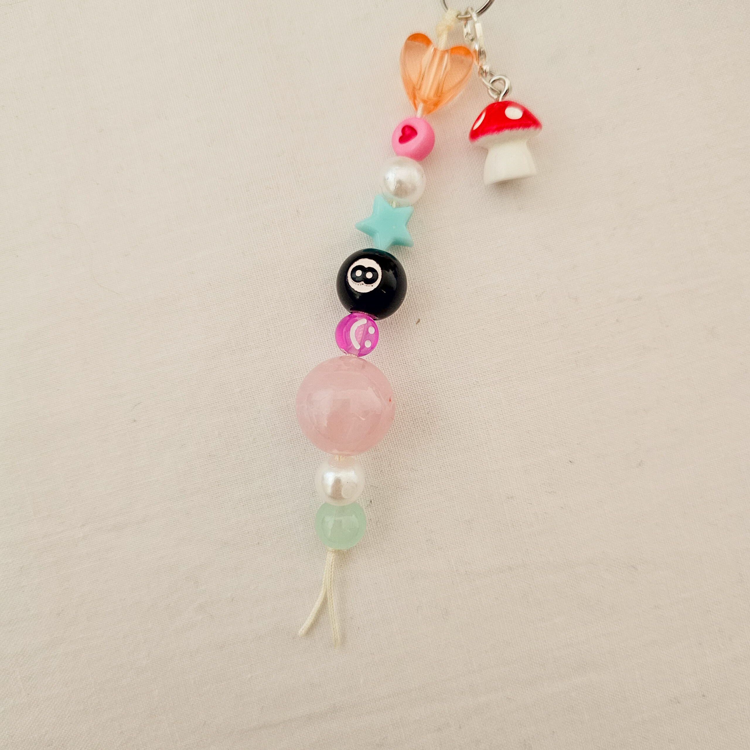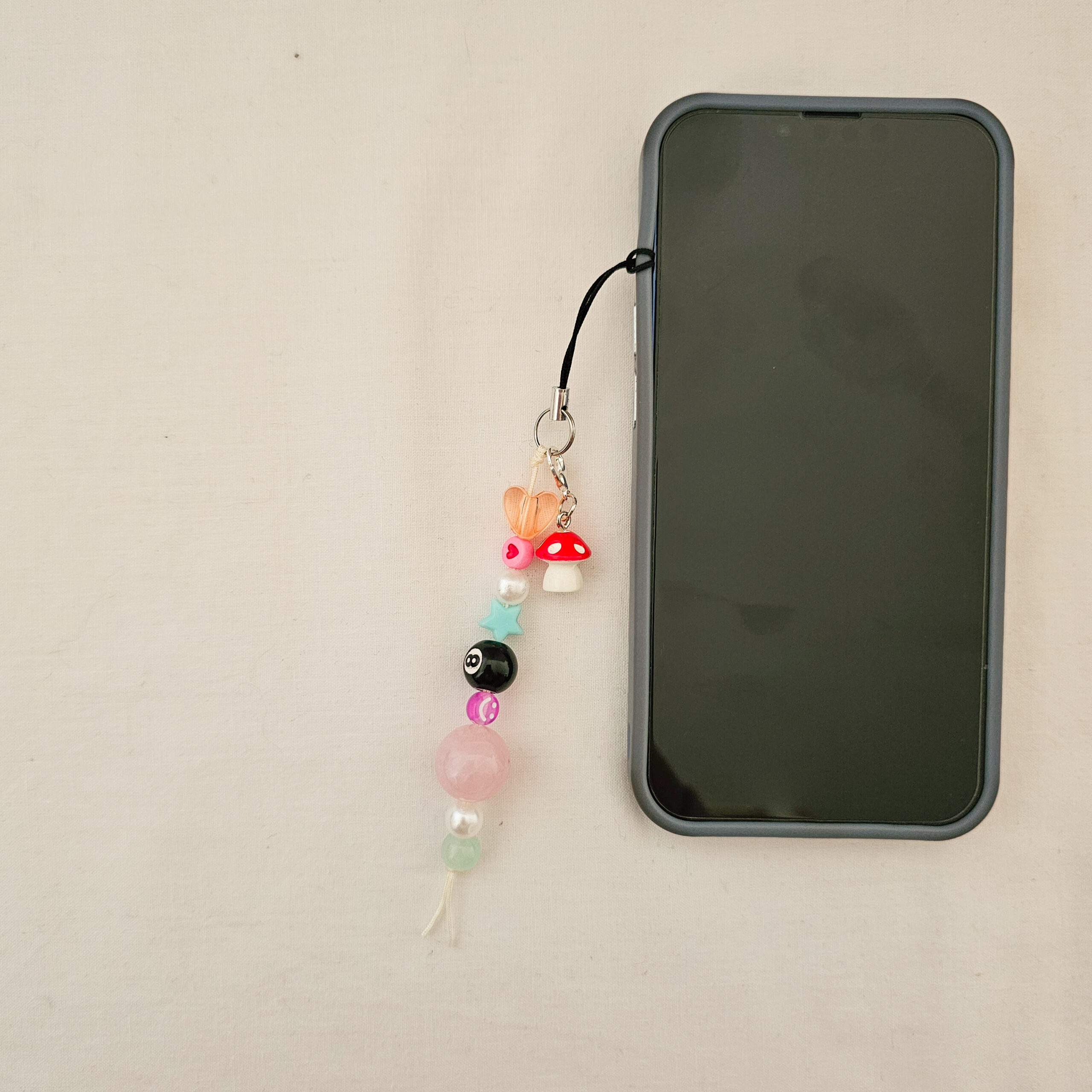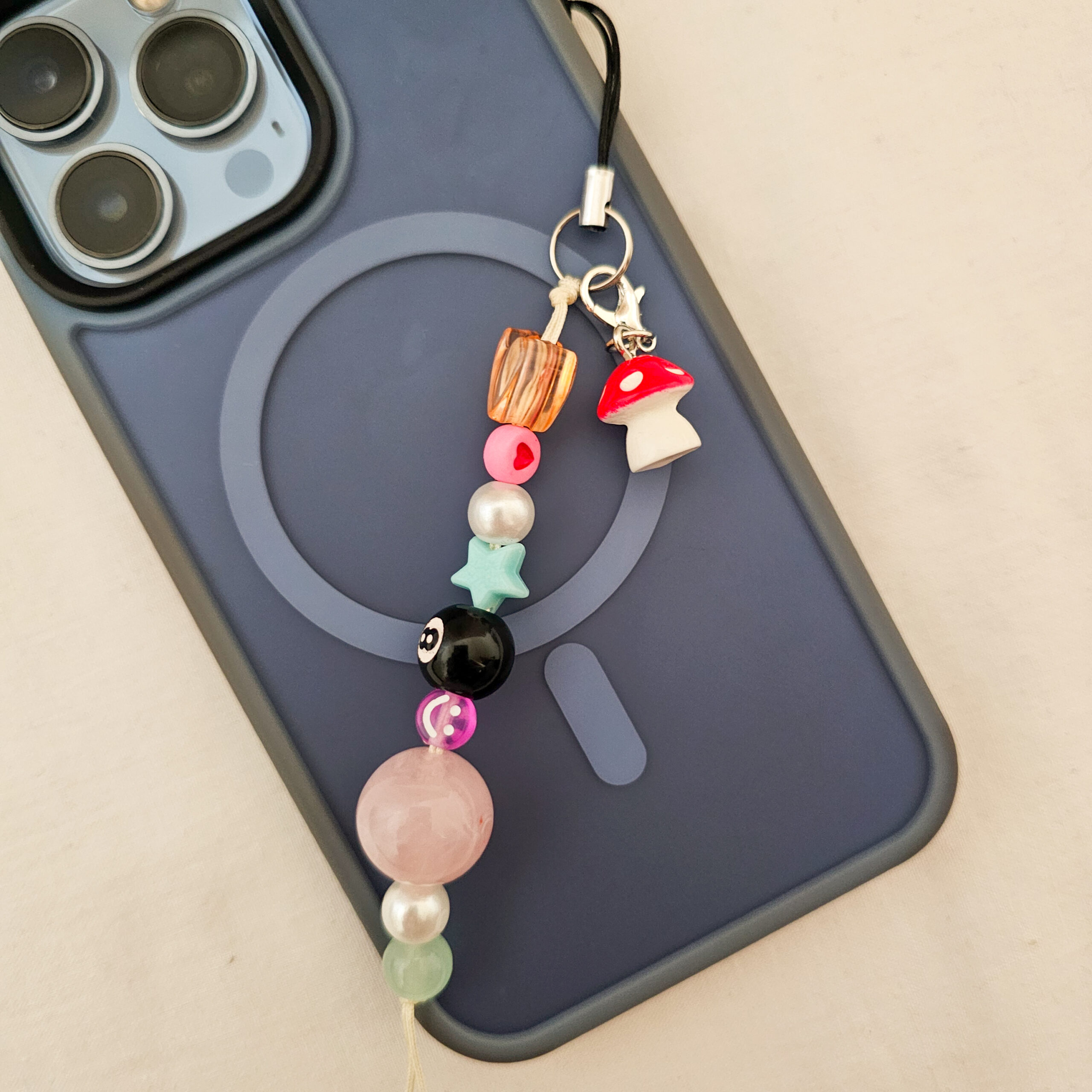 “Mushy Magic” es un phone charm hecho a mano en el estudio de Limeteart que combina una mini seta roja adorable con abalorios pastel, estrellas, perlitas y una bola 8 retro que le da un toque divertido y muy especial.