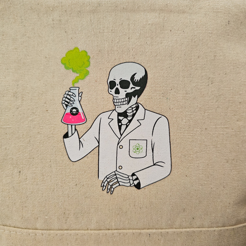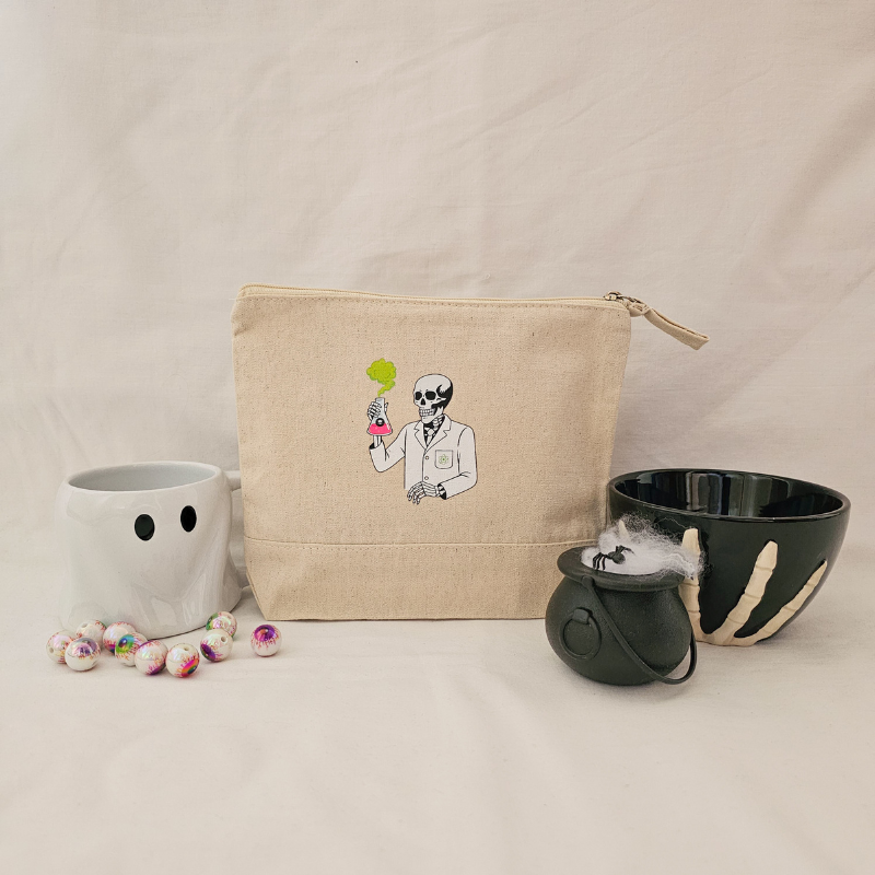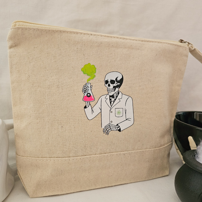 Este neceser de maquillaje con estampado de esqueleto científico es la mezcla perfecta entre lo terrorífico y lo divertido. Fabricado en resistente lona de algodón, este estuche con cremallera es ideal para guardar maquillaje, artículos de viaje o material escolar. Su diseño original aporta un toque único y llamativo a tus accesorios, convirtiéndolo en un imprescindible para amantes de la ciencia y fans de Halloween.