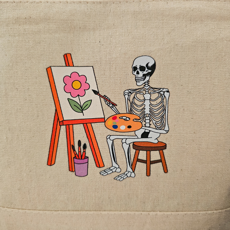El divertido estampado muestra a un esqueleto pintando una flor, uniendo el aire spooky con la creatividad, lo que lo hace ideal para artistas, pintores o cualquiera que disfrute de accesorios inspirados en Halloween.