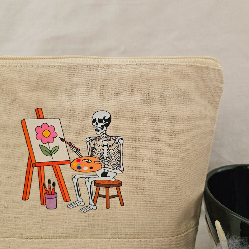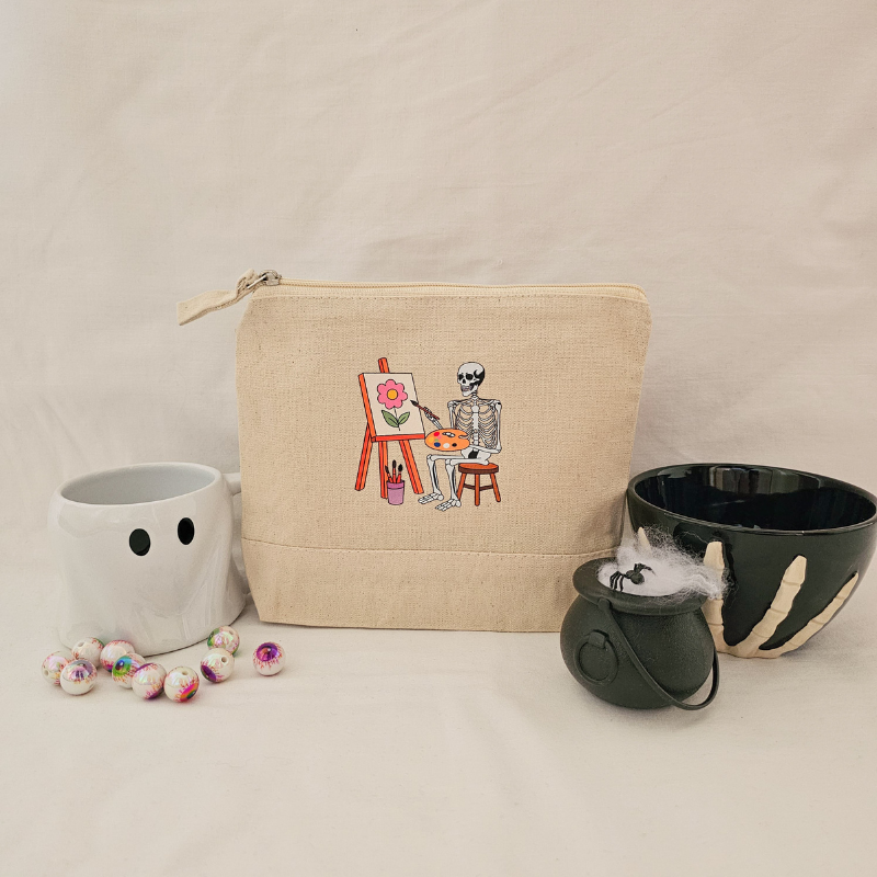 Este neceser de algodón con diseño de esqueleto pintor es un accesorio único de Halloween para los amantes del arte. Confeccionado en resistente lona de algodón y cierre de cremallera, es versátil y puede usarse como neceser de maquillaje, bolsa de aseo o pouch de viaje.